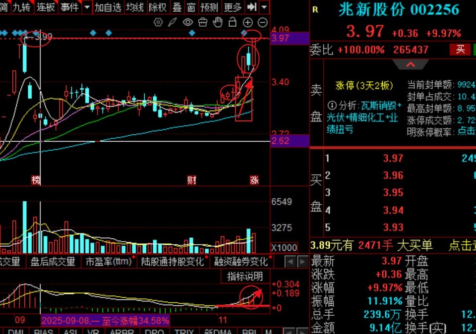 4、兆新股份:电力+染料+光伏建筑一体化+绿色电力+融资融券+碳中和+锂电池概念,太阳能光伏发电技术的研发、生产;抢占低浓度瓦斯利用赛道,上周k线形态合理出现阳加阳,前几天股价更是站上所有均线,均线形成多头形态,基本面前期形成金叉,而且在有序扩宽,和技术形态遥相呼应,今天的表现确实符合前期预期,前期的压力位轻而易举就能突破,个人觉得短期内还会有空间出现。