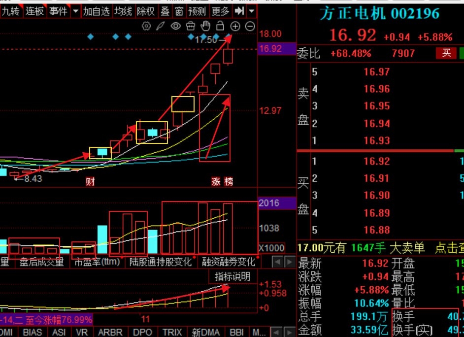 方正电机:已经出现六连阳,量能持续充足,基本面macd在中轴线上方有序上行,换手率,板块,封单情况,技术形态,量价关系等等,都是抉择个股的重要因素,一直关注但是没介入,因为上涨途中出现一个缺口,市场规律逢缺必补,缺口越大回补的力度也如此,只是时间问题,所以一直在观望。