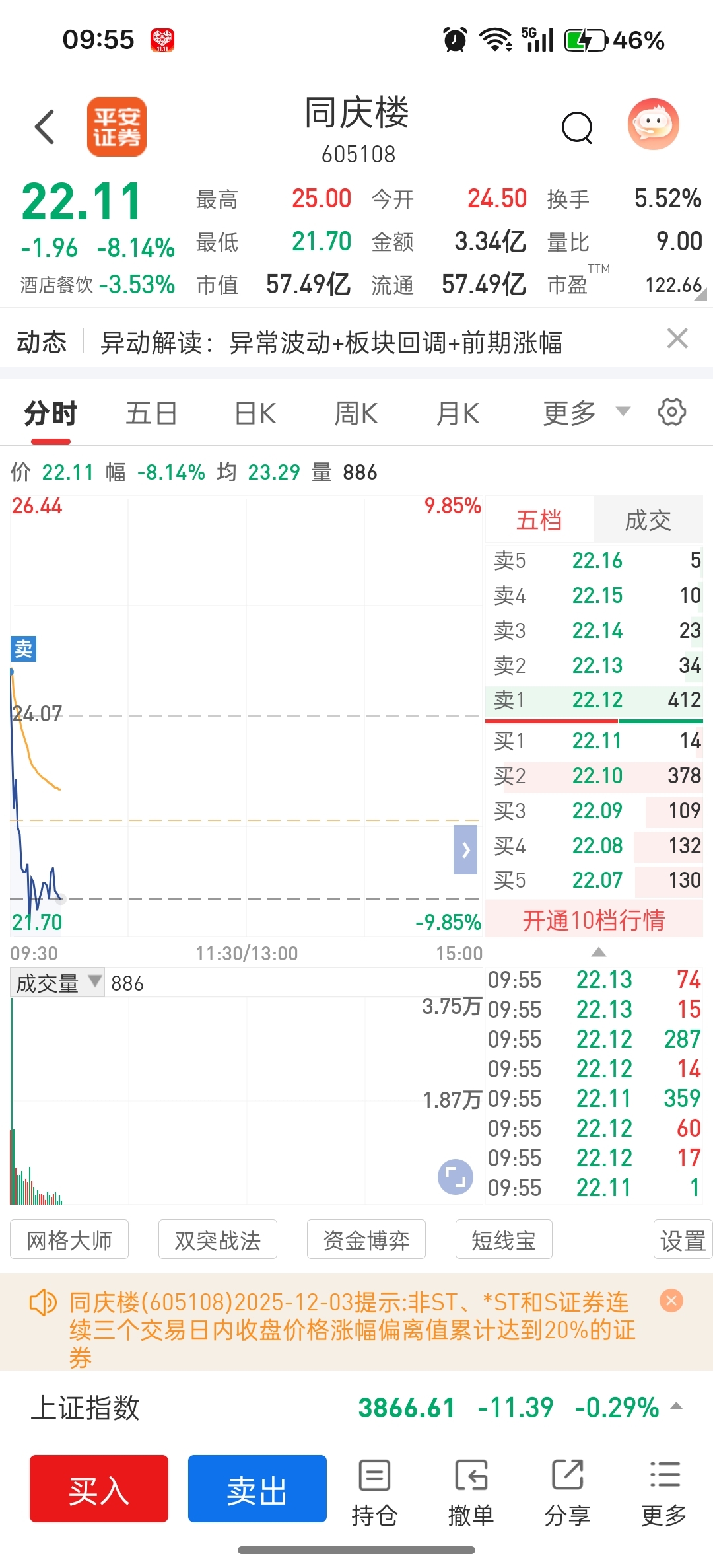 $同庆楼(SH605108)$ 今天先走了,明天应该是买点