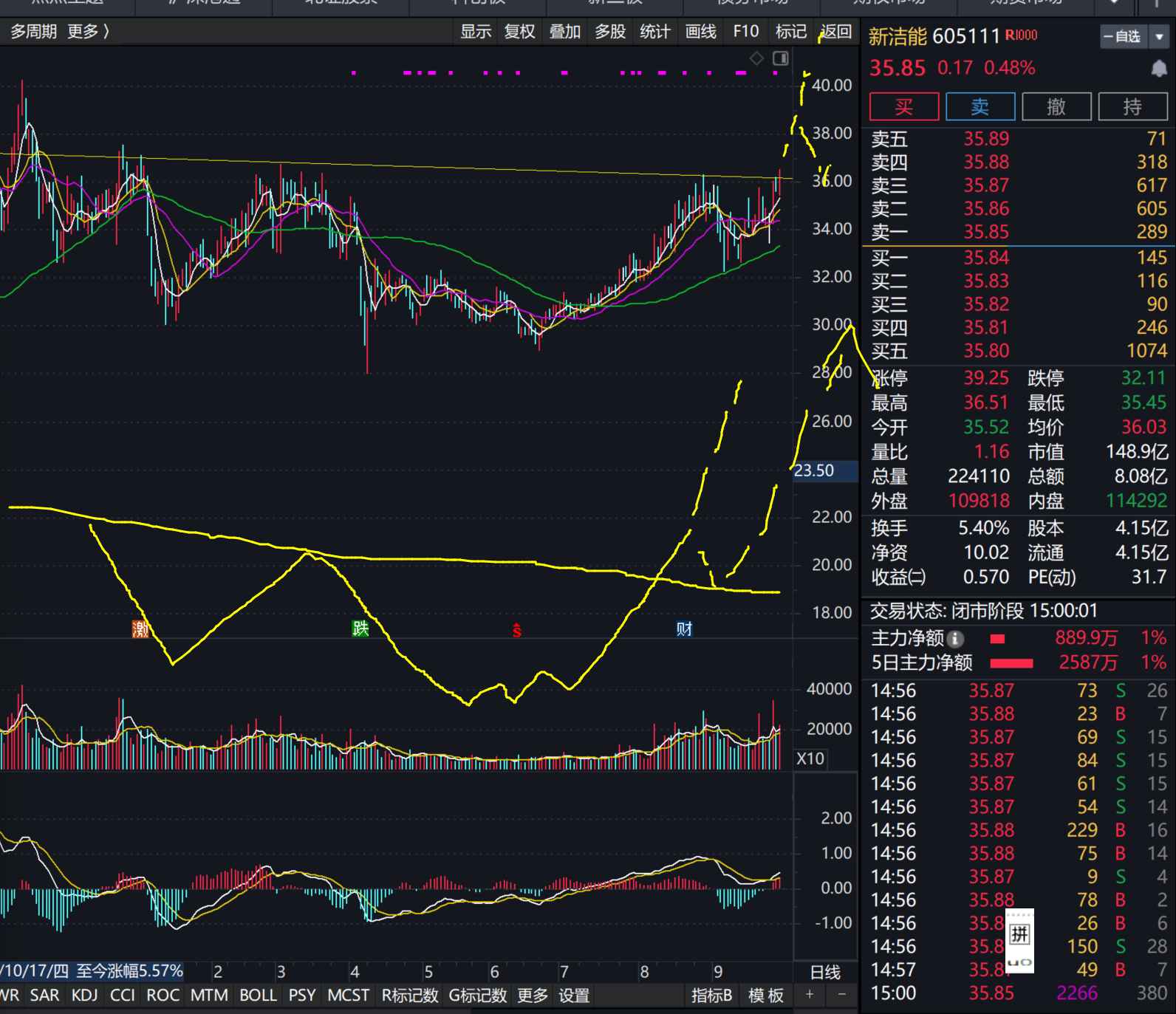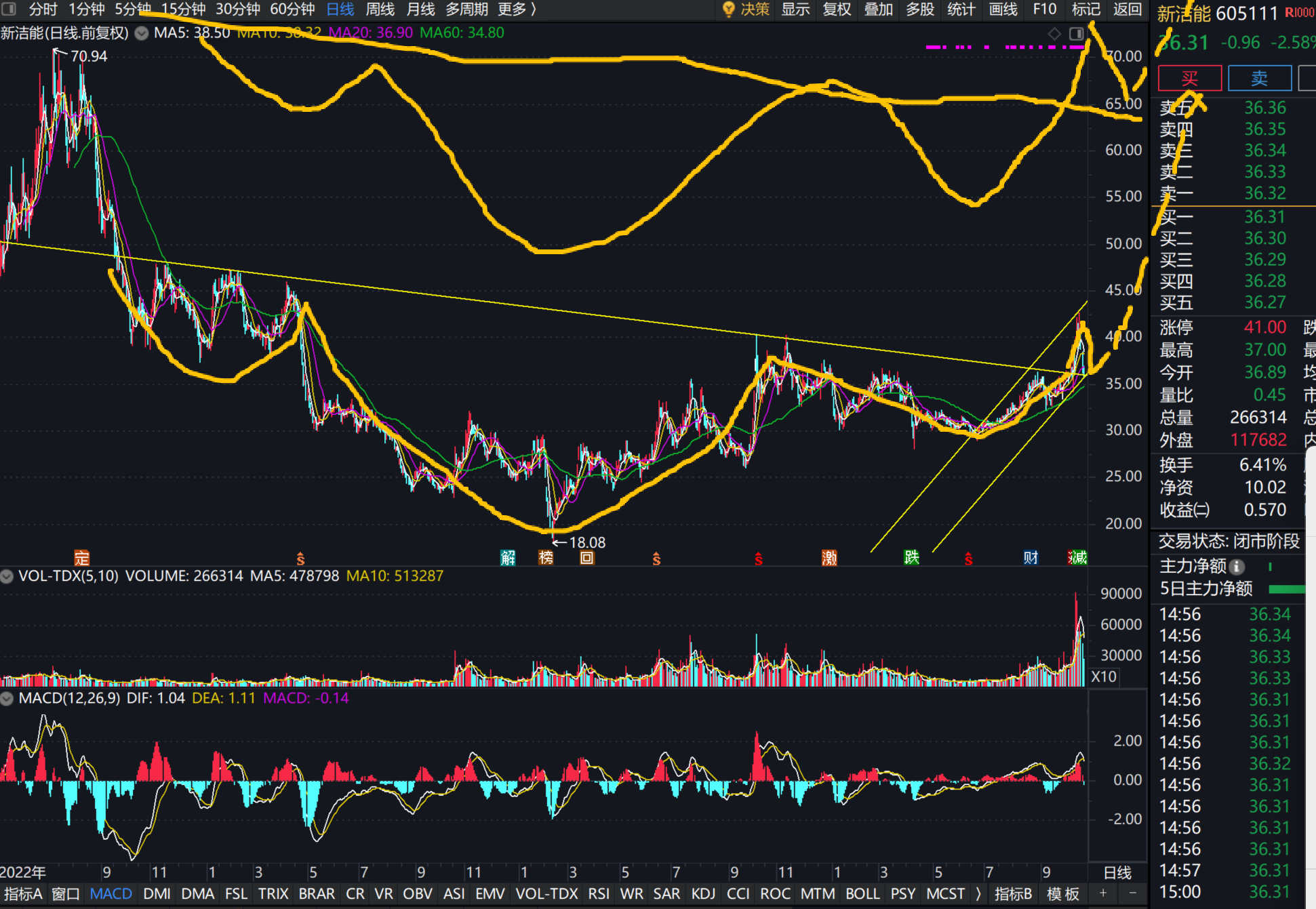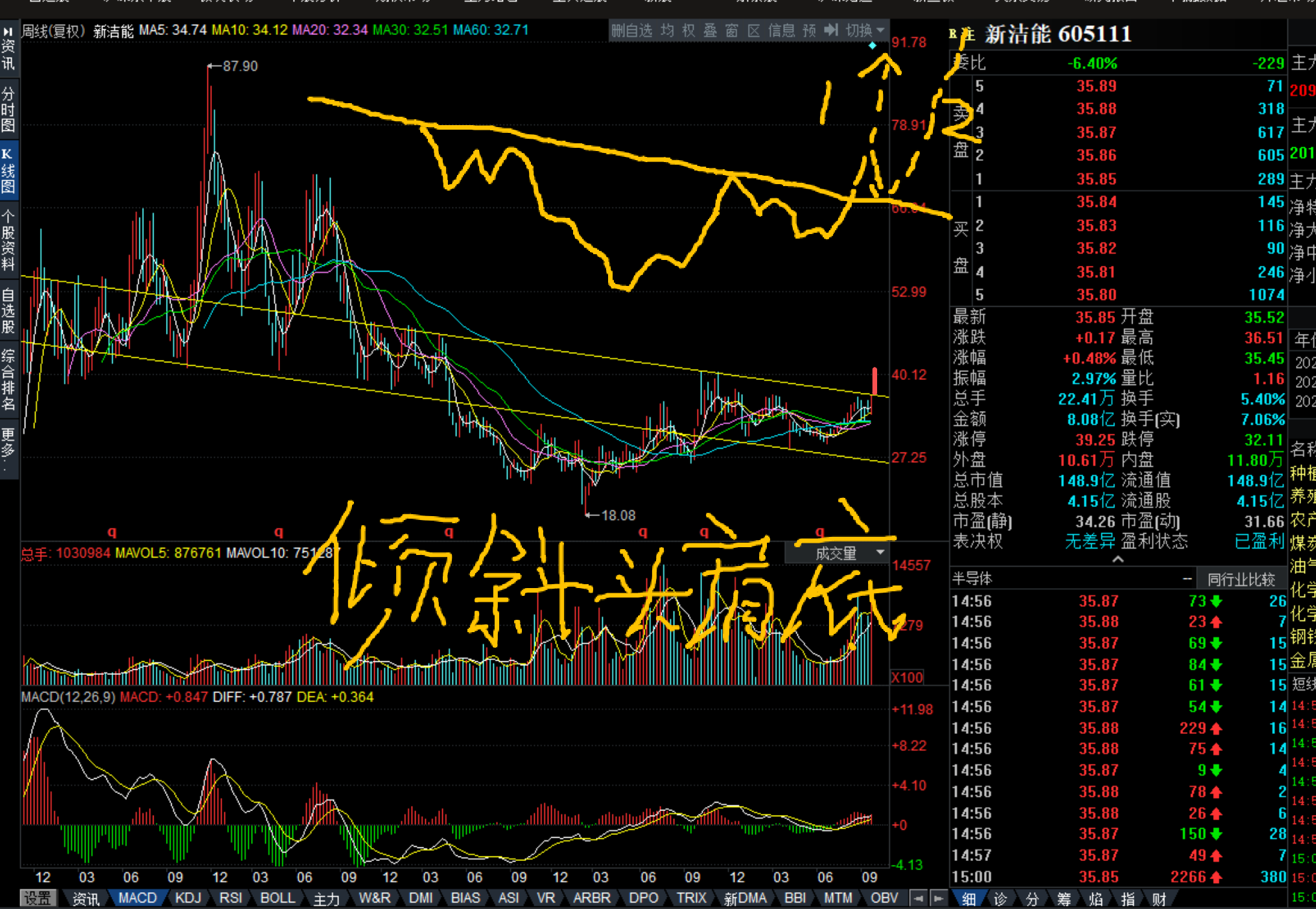1.突破36。31元左右颈线涨到了42.70元(我26日画图发帖时候是35.85元)