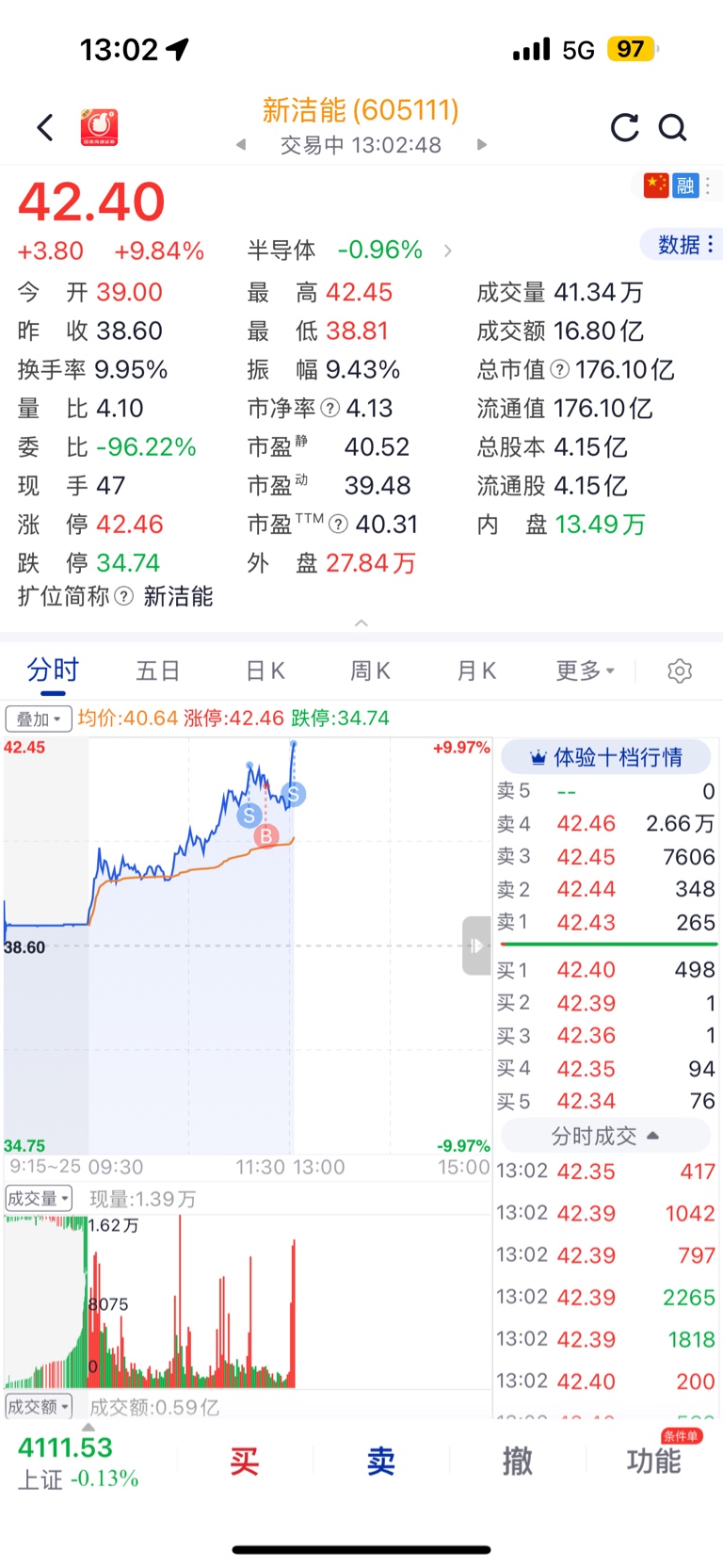 $新洁能(SH605111)$ 今天38.6×1.1=42.46
