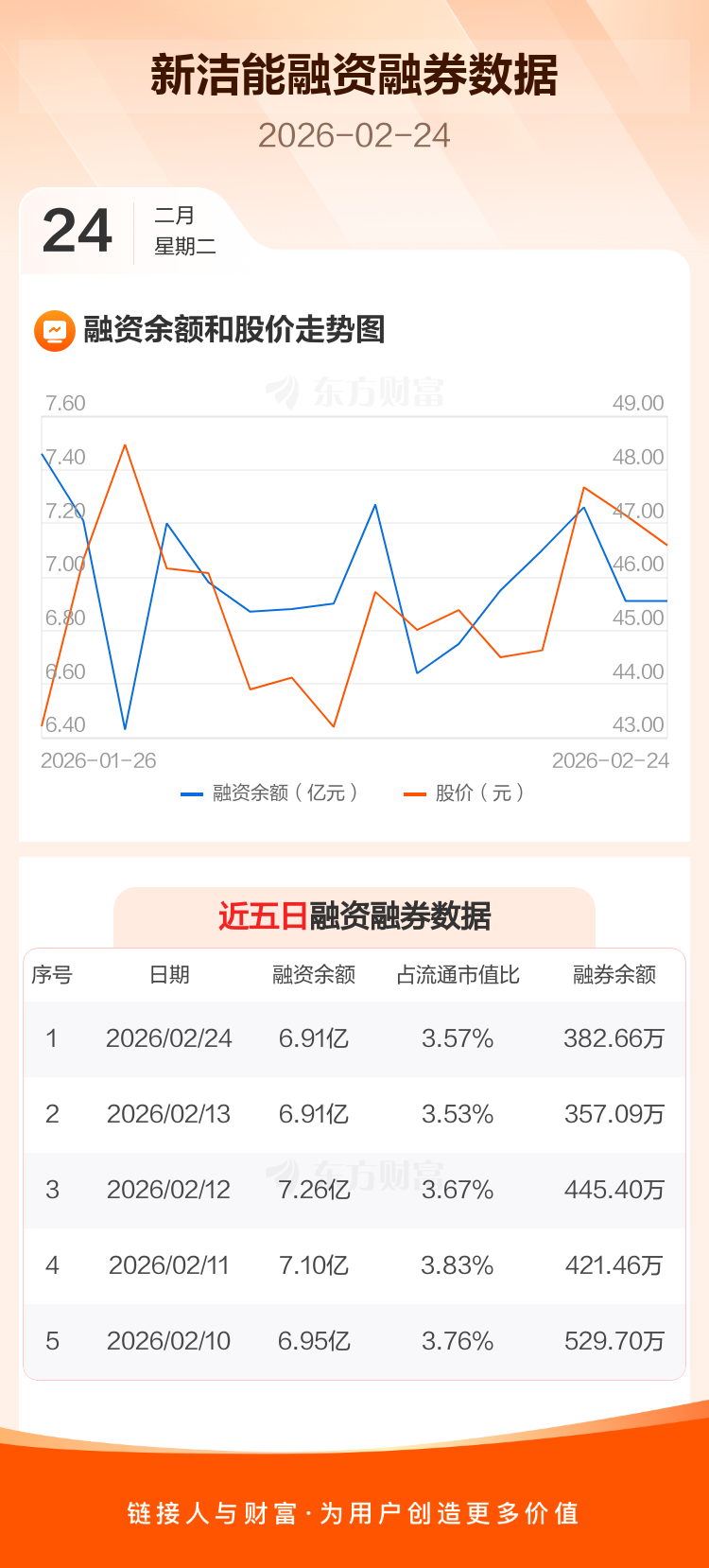 交易所最新数据显示,新洁能于2026年2月24日获融资买入8138.83万元,融资偿还8148.31万元,当日融资净偿还9.49万元。目前,该股融资余额6.91亿,占流通市值比例为3.57%。