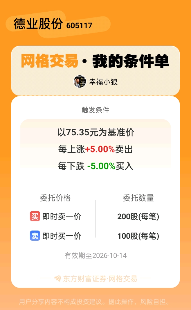 #条件单交流# #网格交易晒单# 一位股神设置了一个网格交易条件单,接下来就是见证奇迹的时刻~$德业股份(SH605117)$