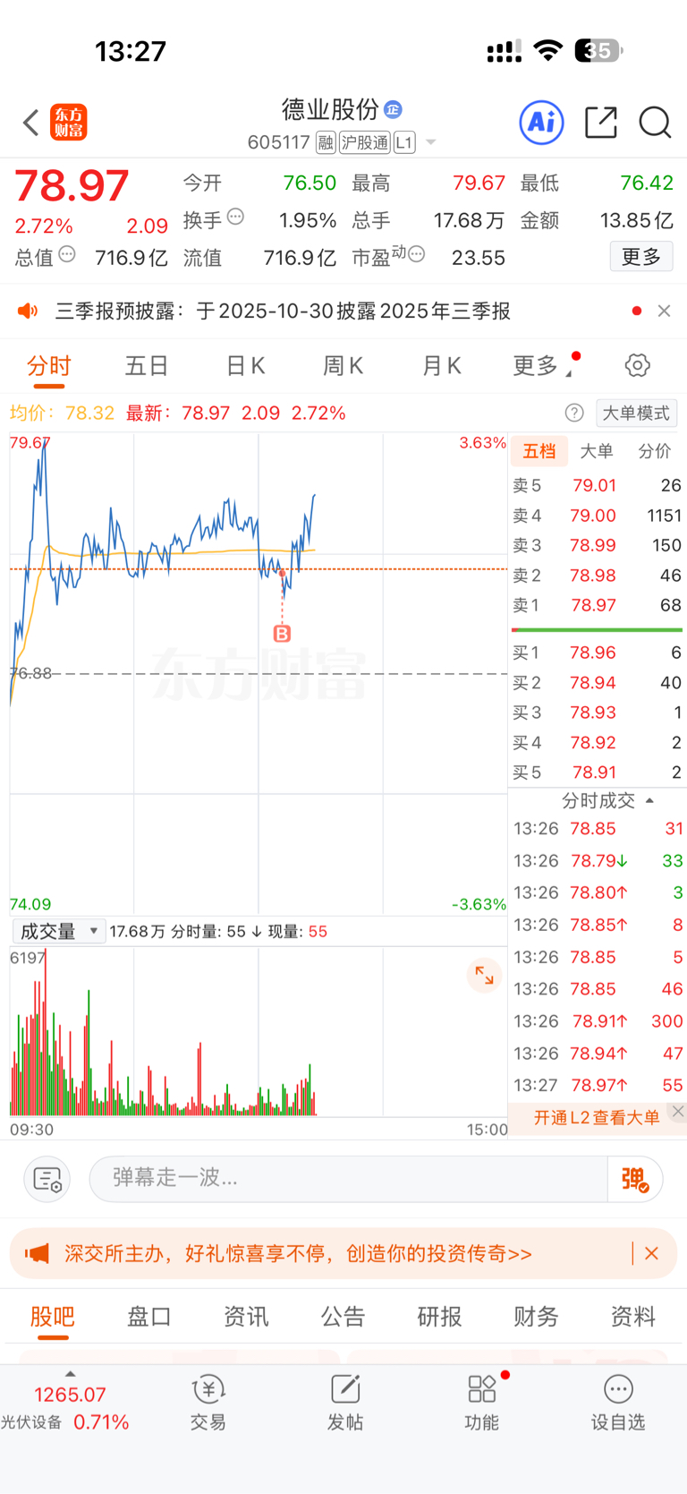 $德业股份(SH605117)$ 上午错过了水下,下午进来了