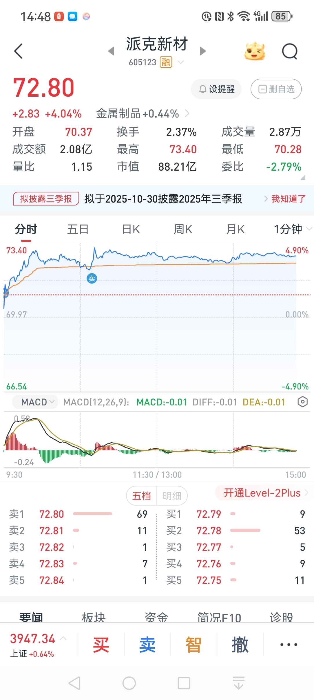 $派克新材(SH605123)$ 这个票今天是操作最失败的一次,我一出不到一分钟就上73了,但是错了就的认,我很喜欢这个票弹性特别好