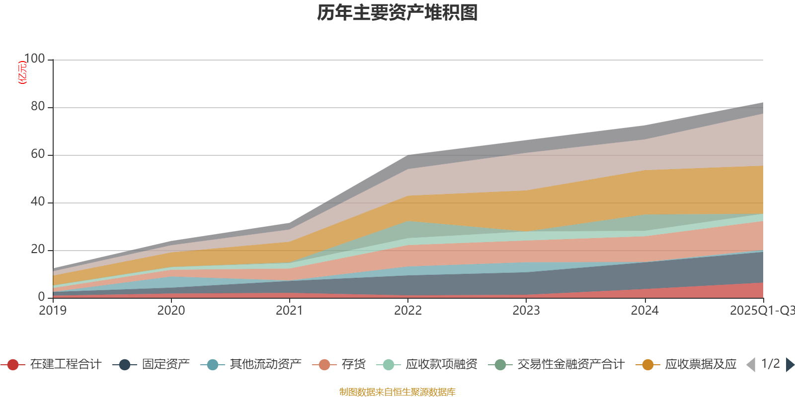 资产重大变化方面,截至2025年三季度末,公司交易性金融资产合计较上年末减少100%,占公司总资产比重下降9.49个百分点;货币资金较上年末增加69.31%,占公司总资产比重上升8.82个百分点;在建工程合计较上年末增加74.76%,占公司总资产比重上升2.72个百分点;其他非流动资产较上年末减少71.29%,占公司总资产比重下降2.04个百分点。