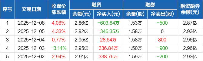 派克新材:融资净偿还603.84万元,融资余额2.86亿元(12-08)