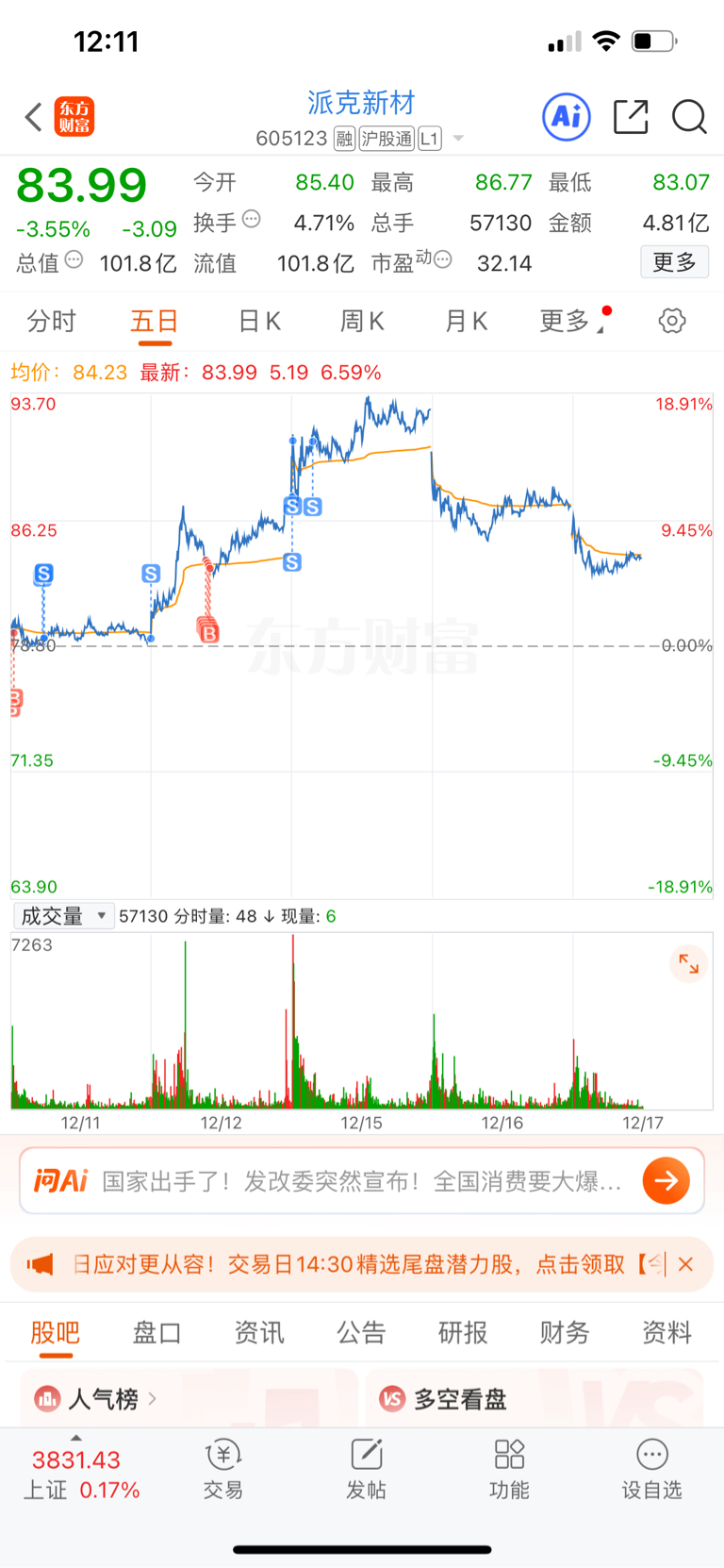 $派克新材(SH605123)$ 手很痒!给个机会!80接回!