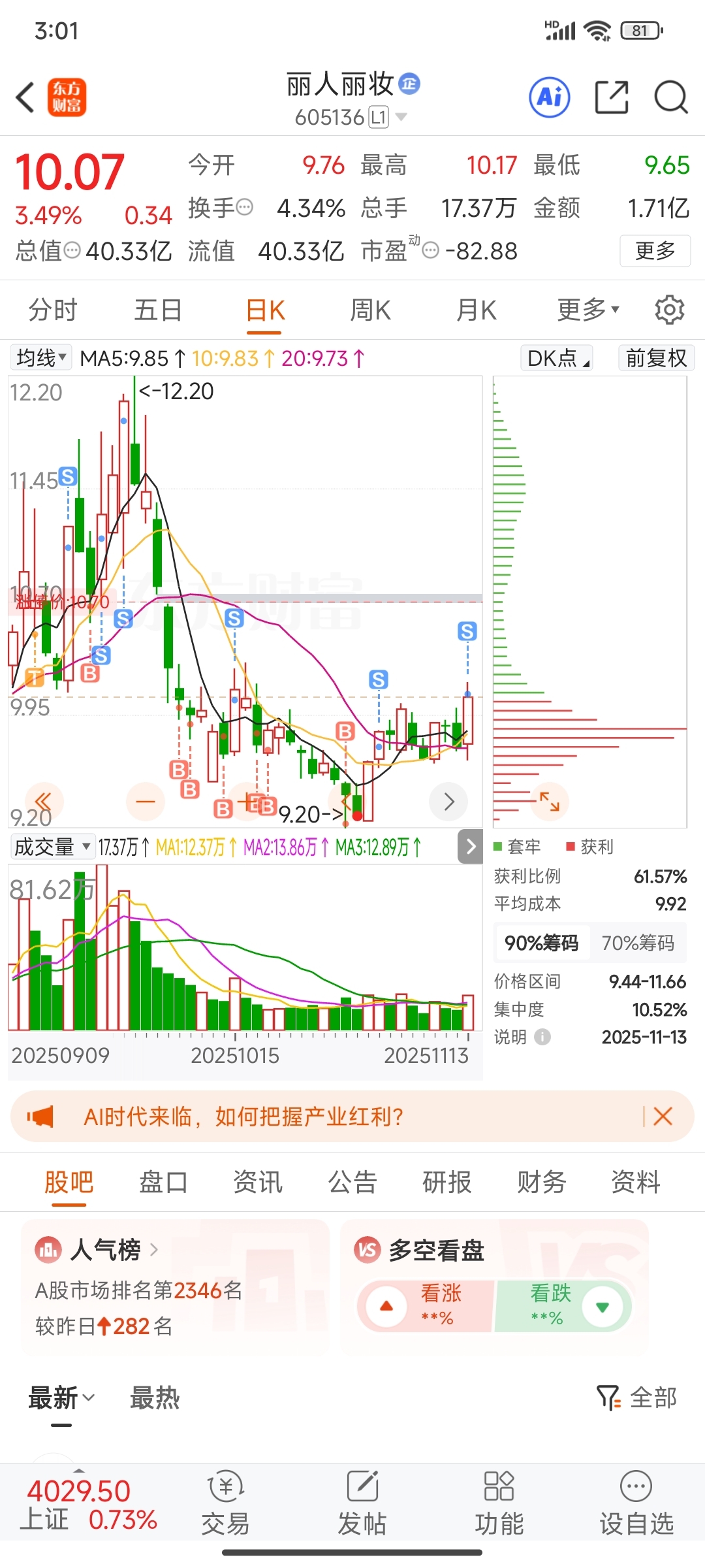 $丽人丽妆(SH605136)$ 溜了,外面的消费股都一个板了,这里还在磨蹭