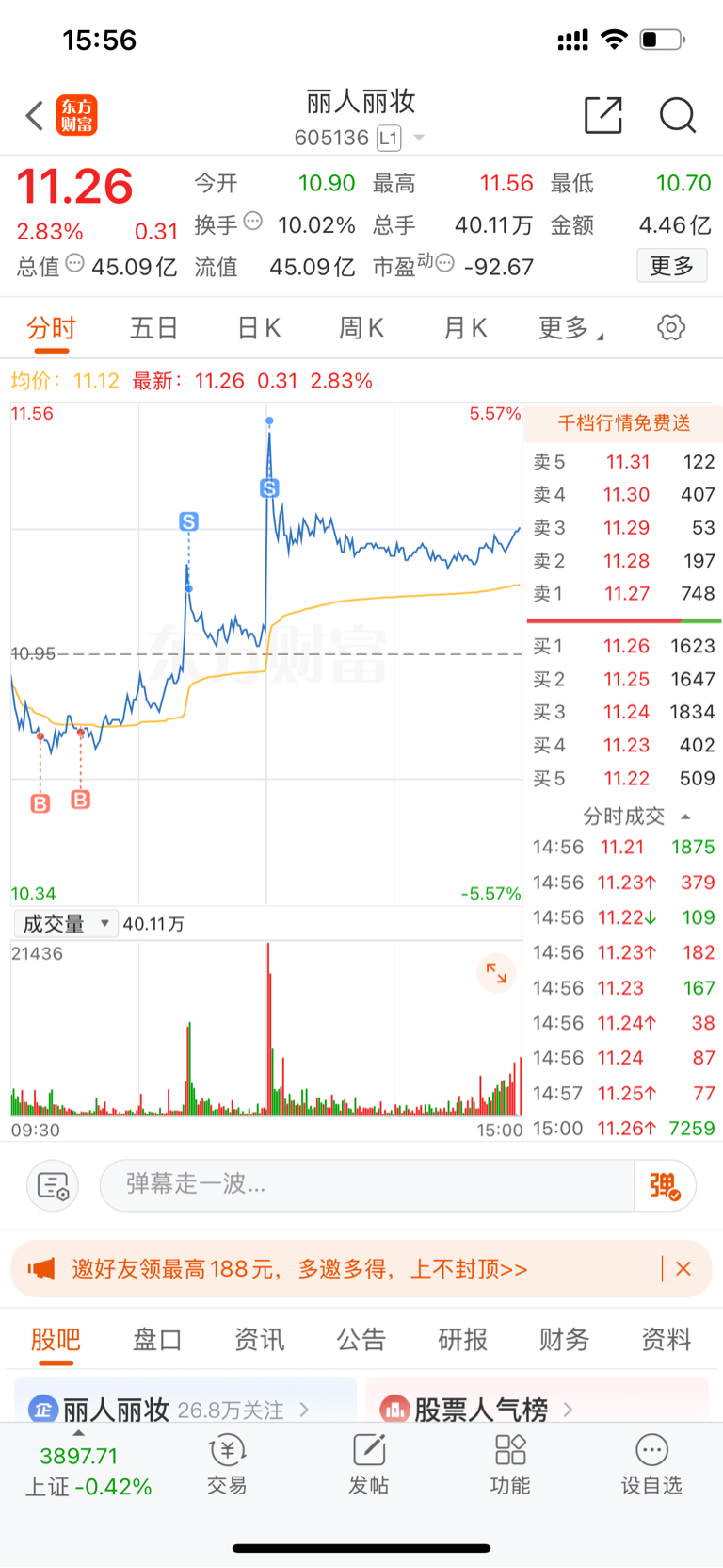 $丽人丽妆(SH605136)$ 两个位置各踢出半仓,今天水下加了一倍,还算可以