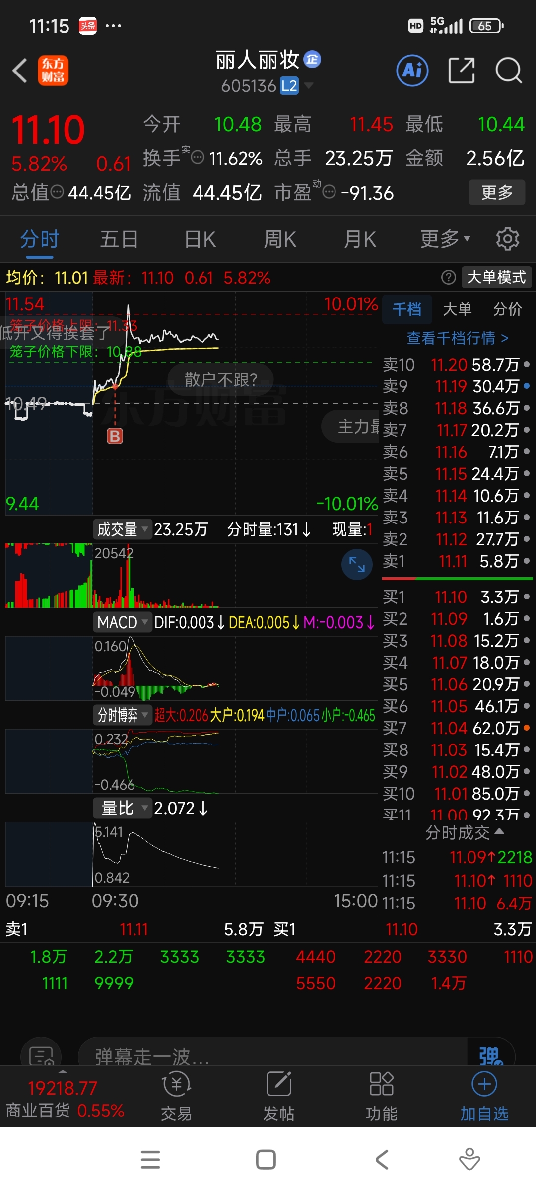 $丽人丽妆(SH605136)$ 主力小老弟,今日必须给大哥涨停,盯你好几天了