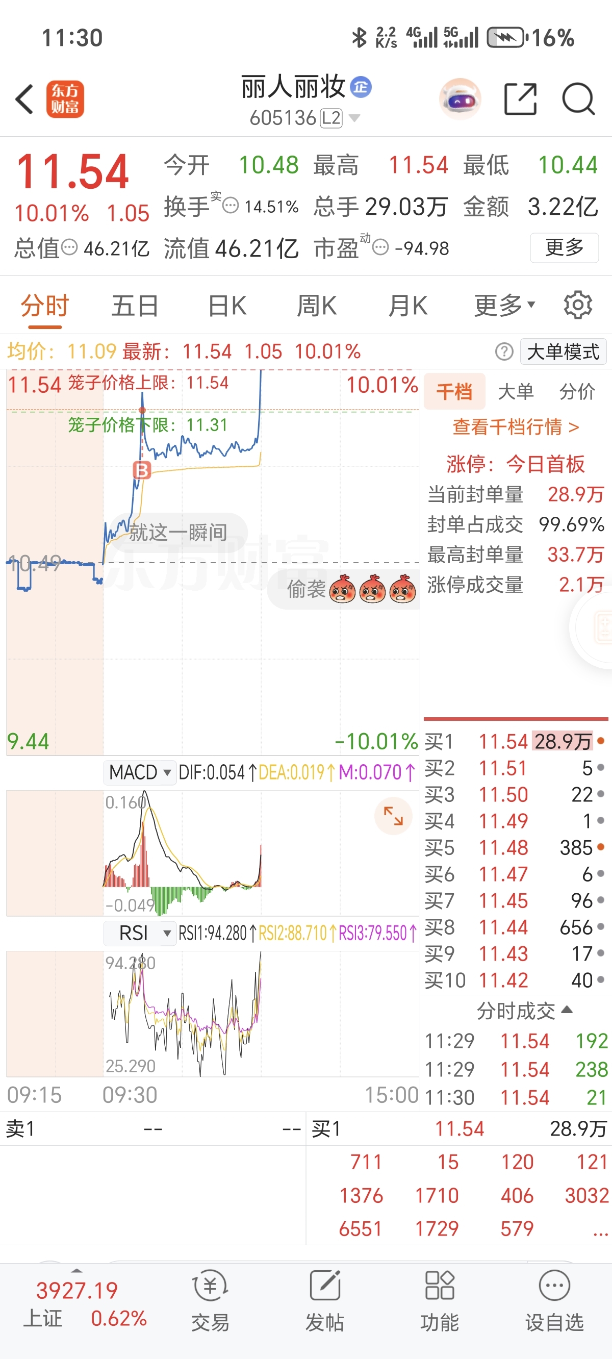 $丽人丽妆(SH605136)$ 早上追高然后秒砸一直横盘差点没把我吓s