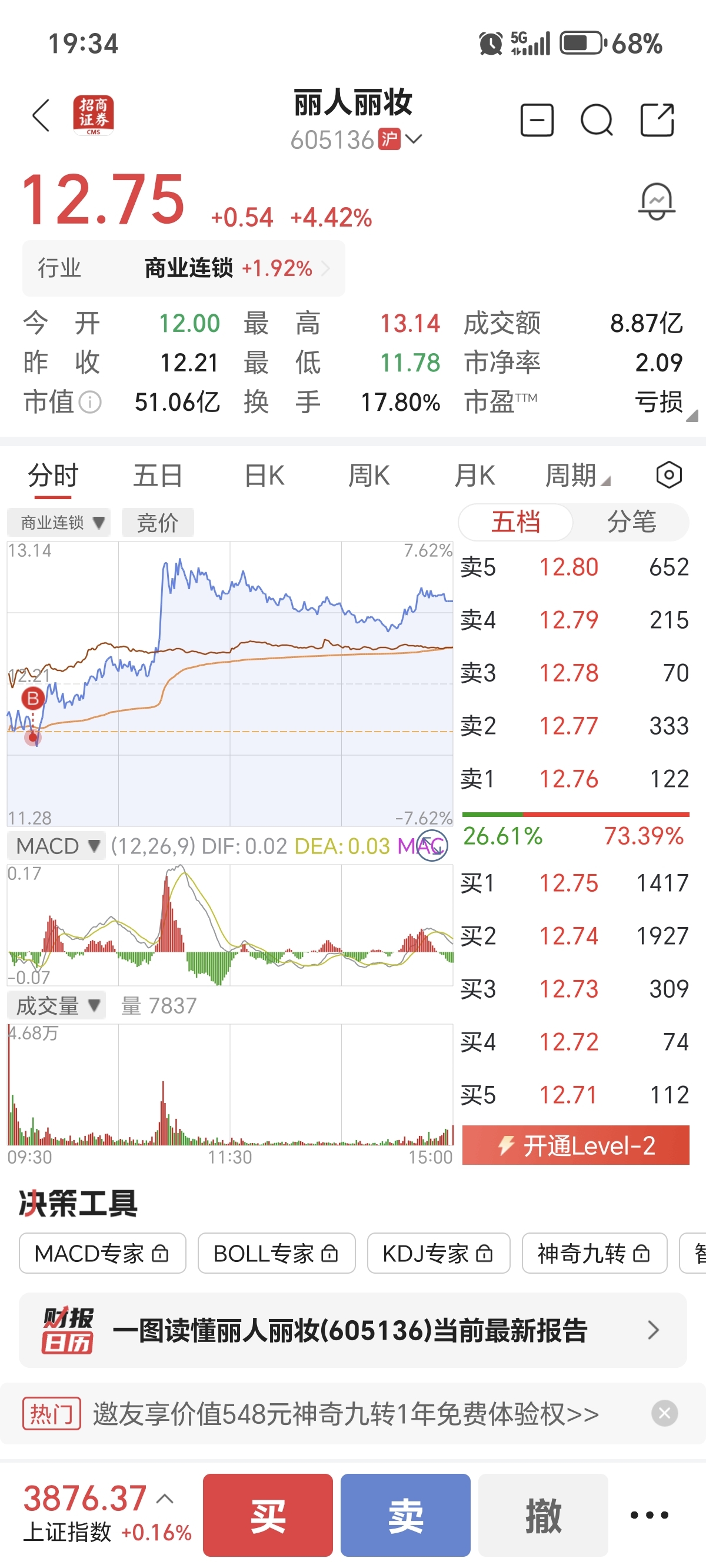 $丽人丽妆(SH605136)$ #炒股日记# 明天给个冲高就行