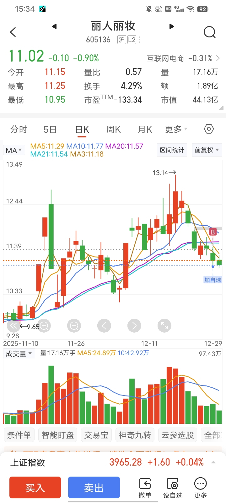 $丽人丽妆(SH605136)$ 今天拿着“小三”底仓,没动(等大跌)。新搞了和顺电气、四方精创