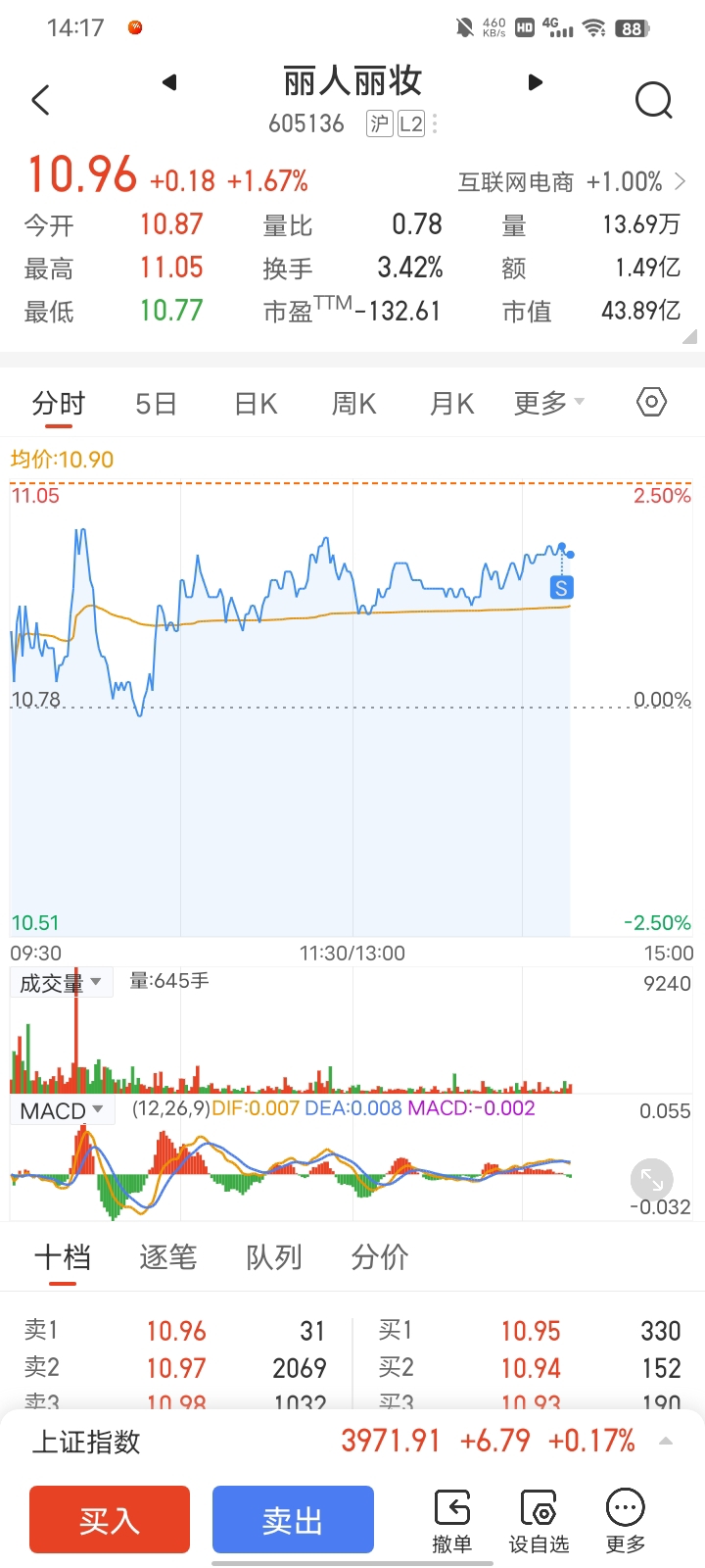 $丽人丽妆(SH605136)$ 过不去,10.96卖出一半