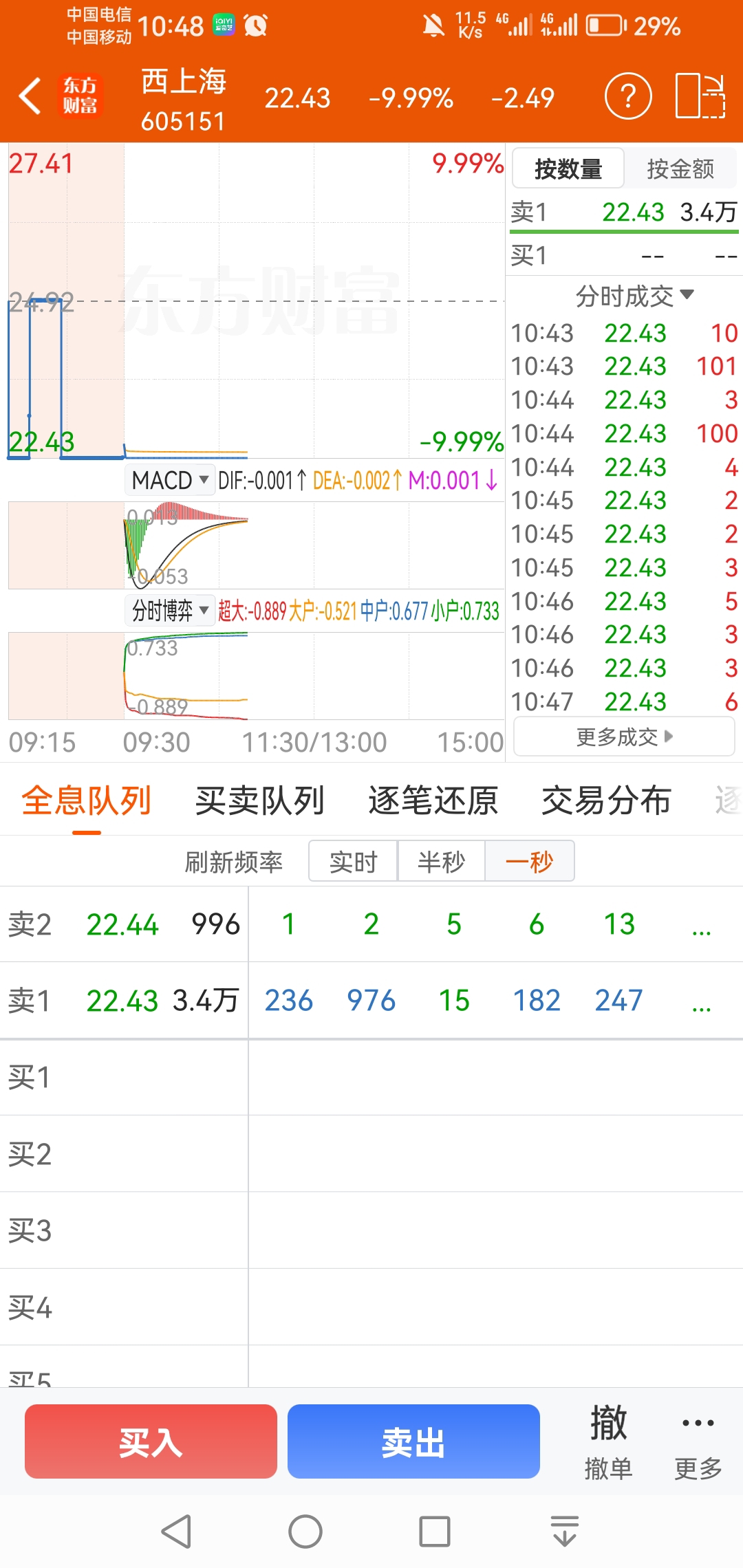 $西上海(SH605151)$ 每分钟才几十手甚至个位数的成交量,不撤单今天就这样封死收盘了