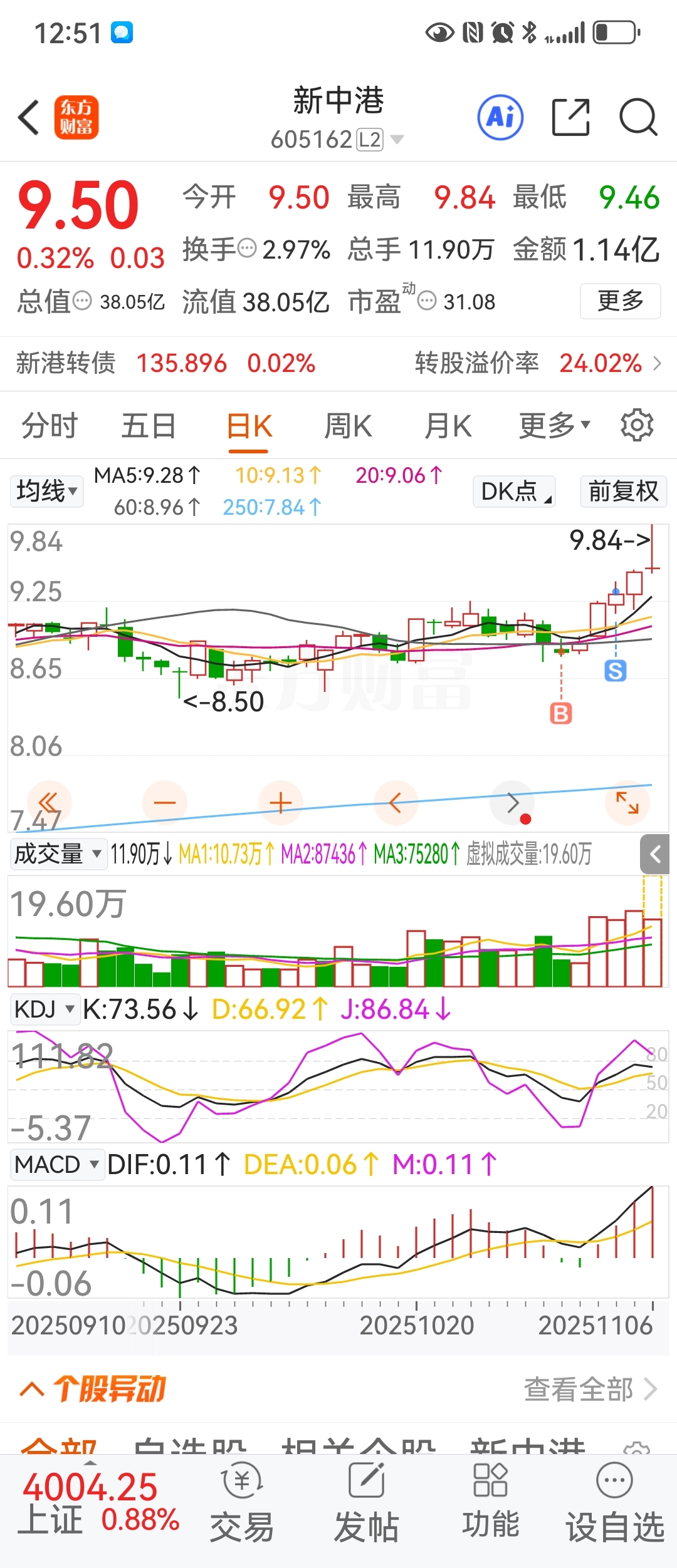 $新中港(SH605162)$ 这个股,今天出现仙人指路了,等回调再买回来,后面会有大机会。(前面买了赚五个点走了,需要耐心等待)