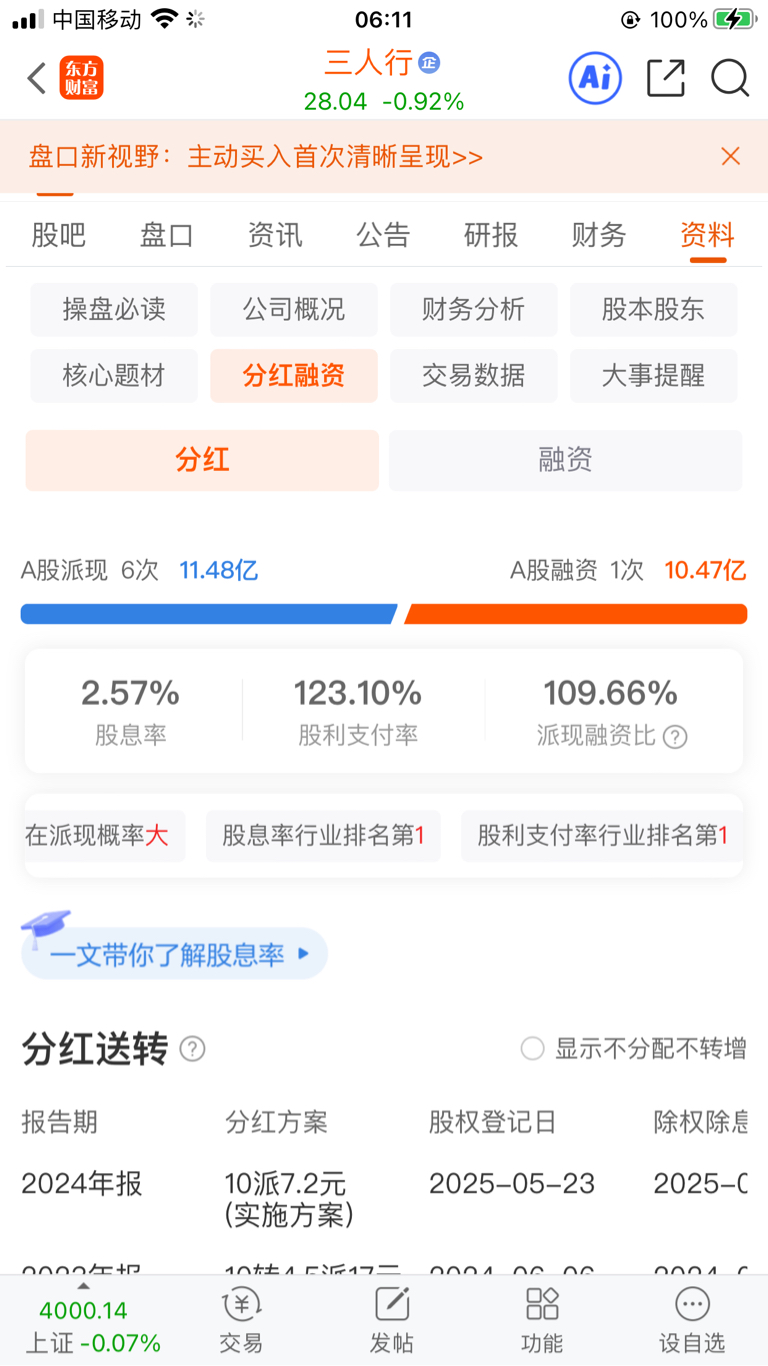 $三人行(SH605168)$ 股息率行业第一就这.天天跌