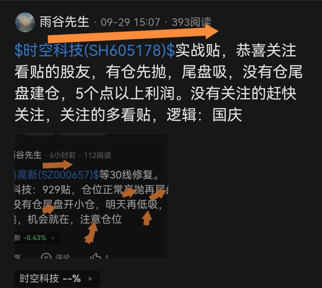 $时空科技(SH605178)$ 关注的看贴多点赞,没有关注的看缘份,没有热贴发贴不出。进来的不要急,跌停有我在,先减仓,里面还有大资金。涨停的不要羡慕,毕竟没有关注,看缘分。仓位2.5~3成。