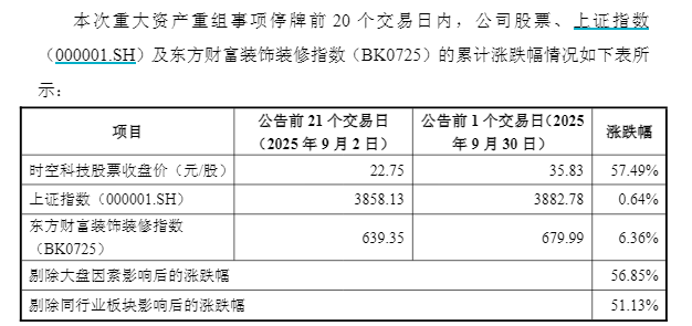 在时空科技本轮停牌前1日,公司股价涨停,本轮停牌前20个交易日,公司股价累计涨幅超57%。对此,公司22日晚间也发布了《董事会关于本次交易信息发布前公司股票价格波动情况的说明》。