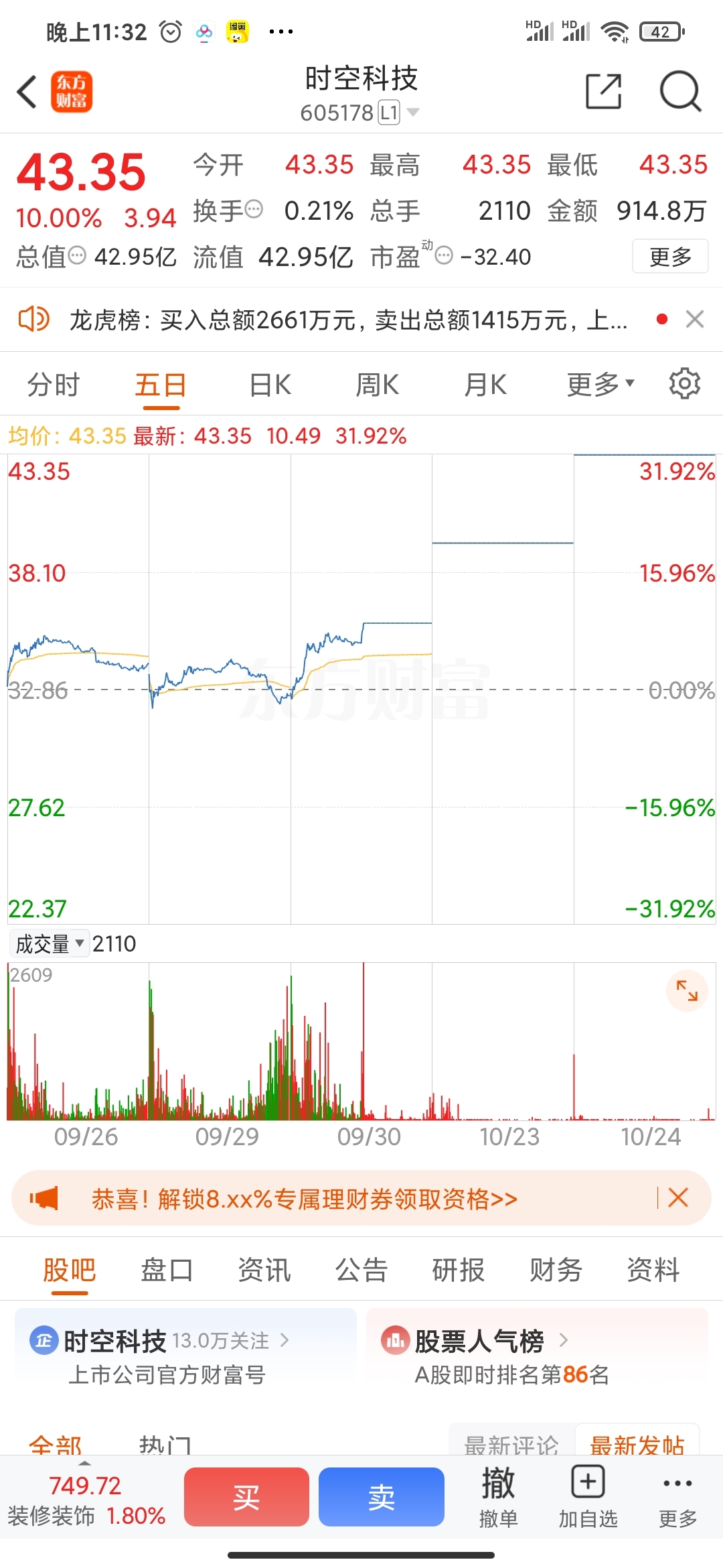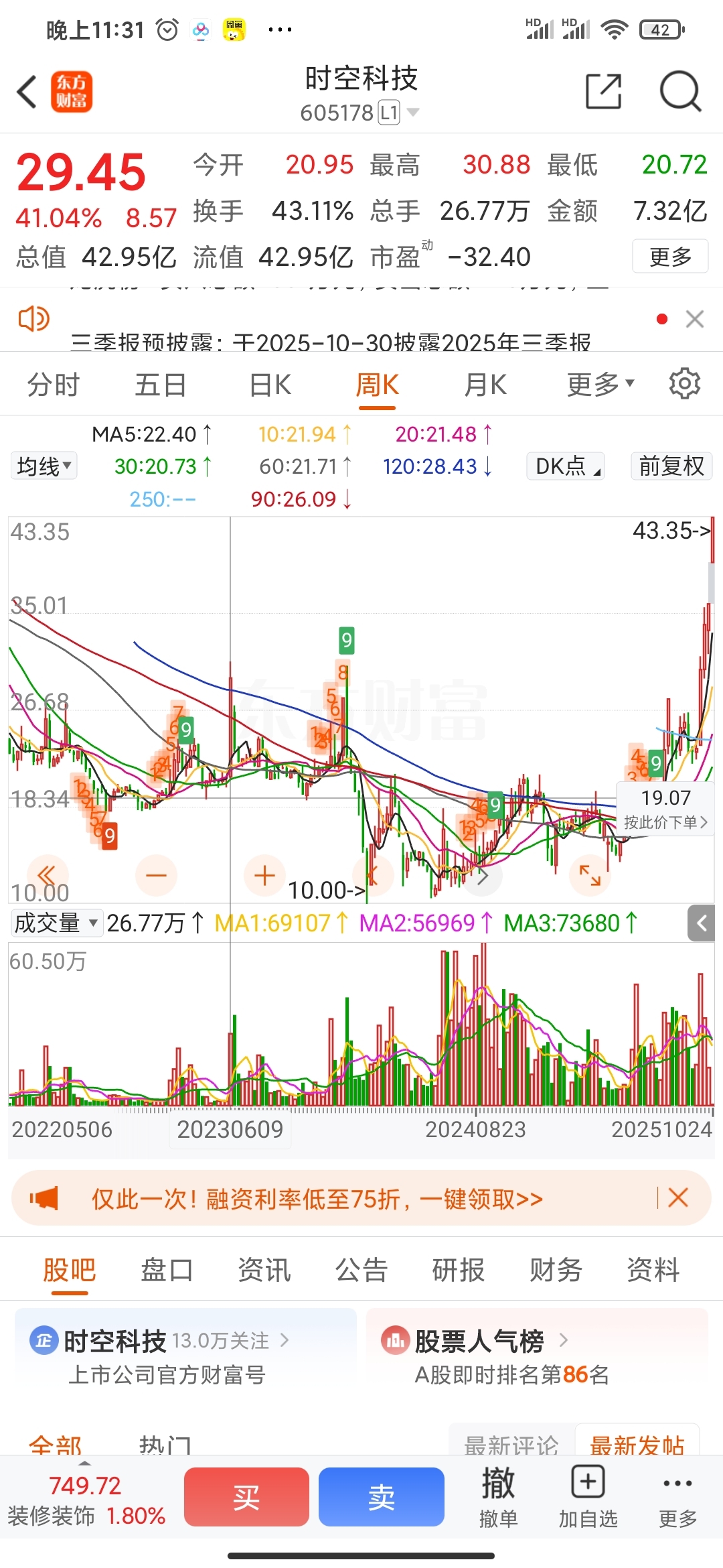 $时空科技(SH605178)$ 原来23不跟鸿博剑桥是没跌到位