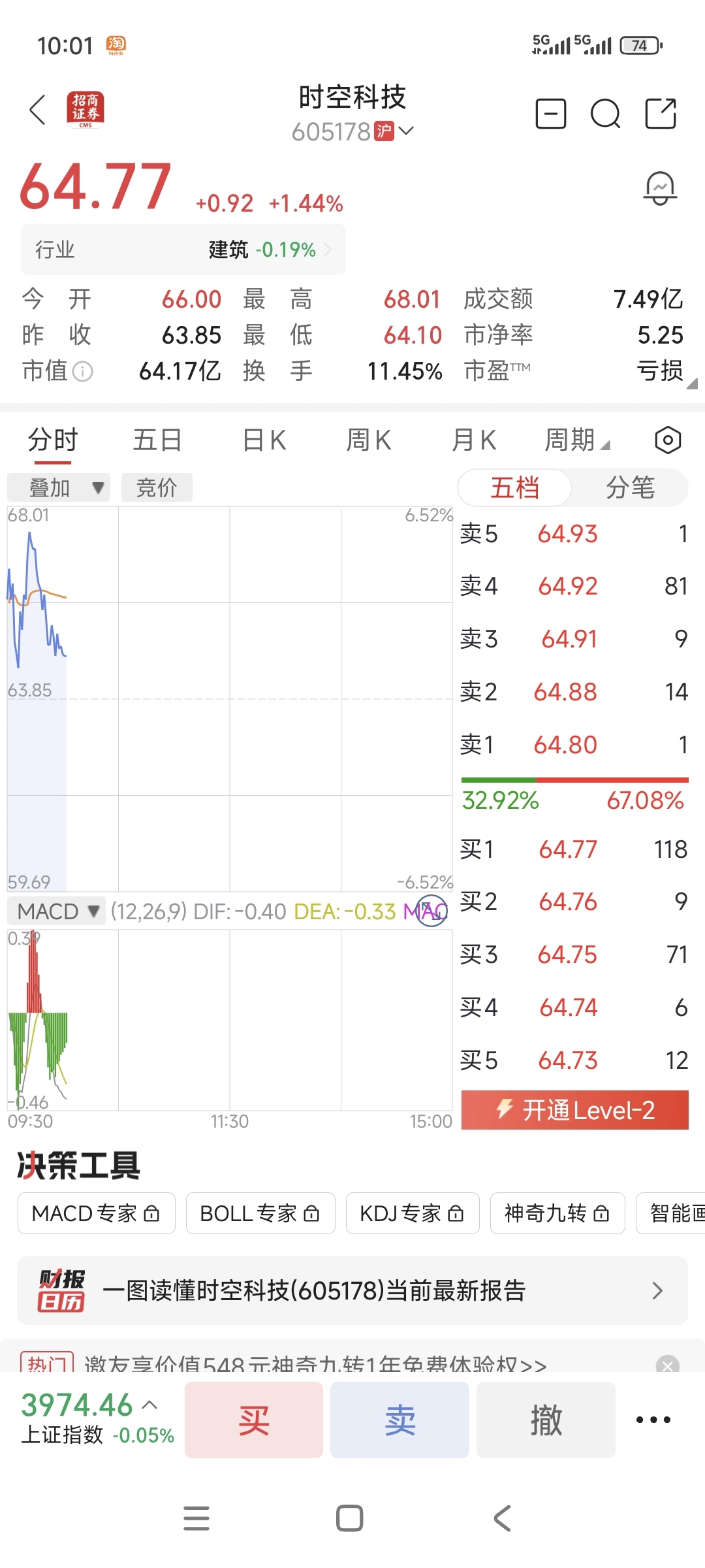 $时空科技(SH605178)$ 64.7己进!!