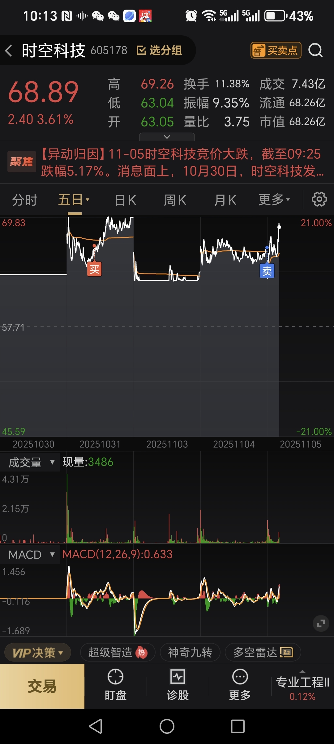$时空科技(SH605178)$ 主力牛逼 一卖就开始冲