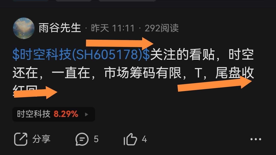 $时空科技(SH605178)$ 关注的多看贴,看评论,尾盘回,早上低吸T,明天先高抛卖。