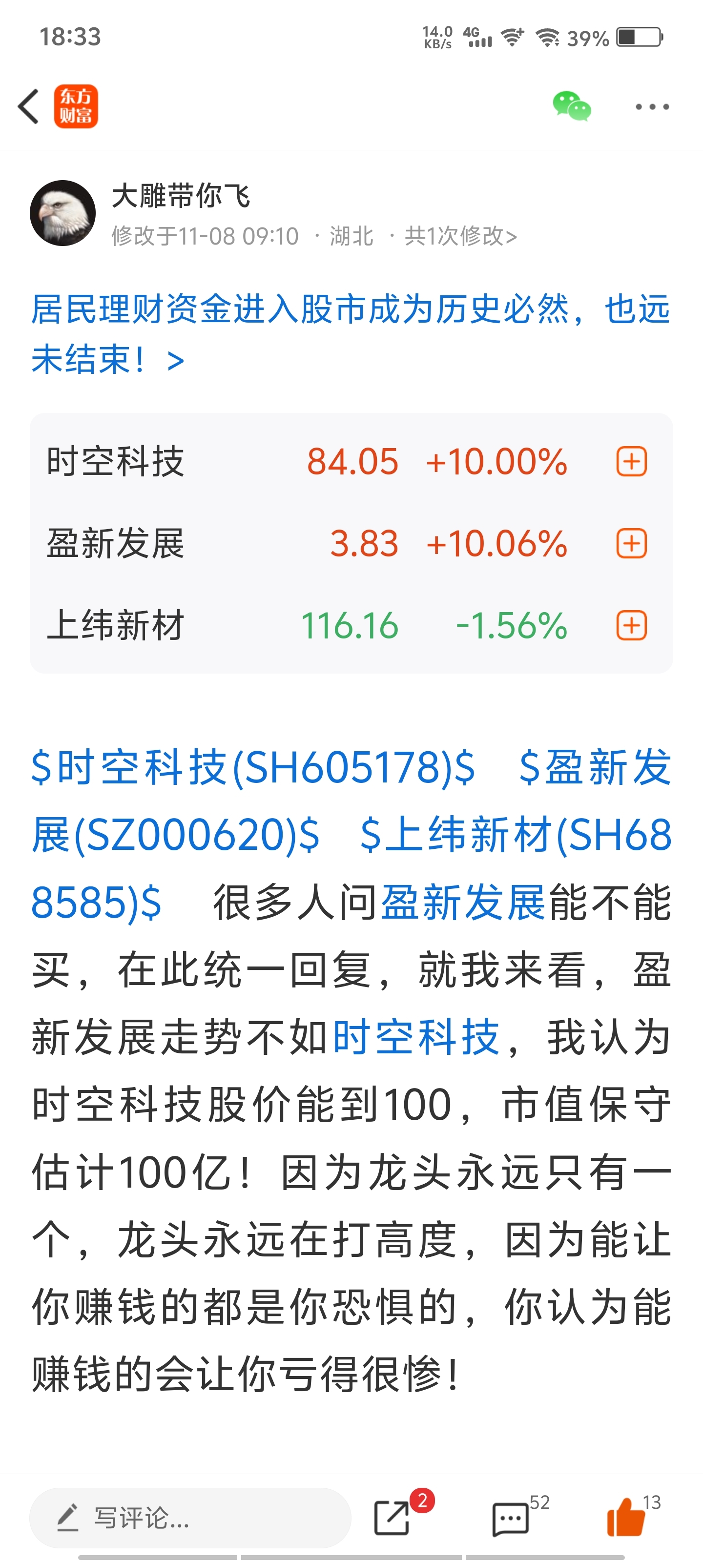 我看好时空科技到100,但是盈新发展走势也不错,在里面的祝福你们继续吃肉别因为我