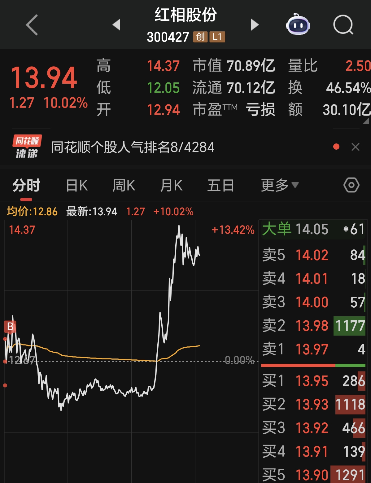 $时空科技(SH605178)$ 朋友们,我早上去买$红相股份(SZ300427)$ 了,一天就赚10个点,比在这里和主力墨迹划算多了,时空科技主力把股价压到52我再买入