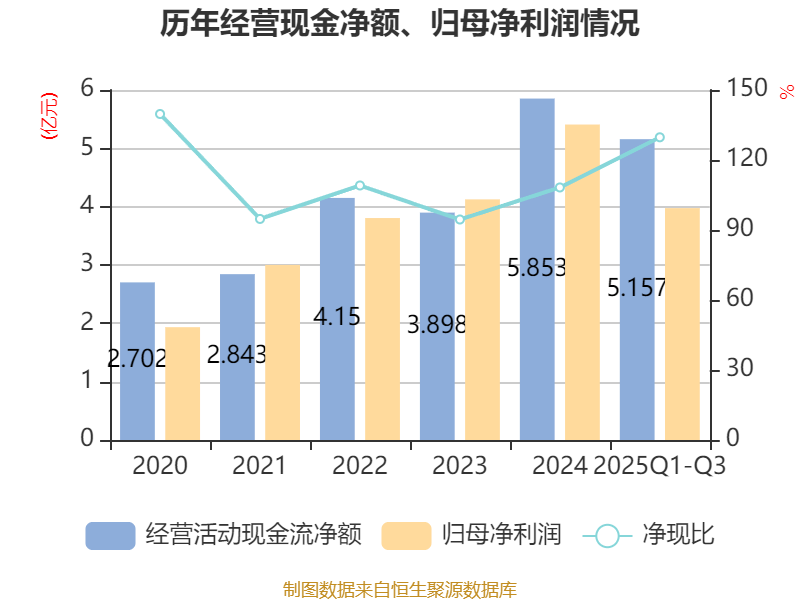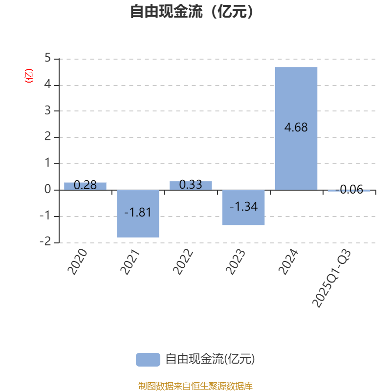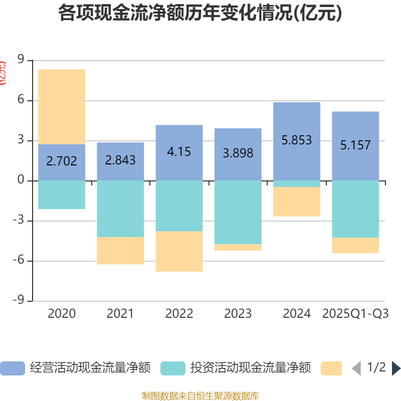 2025年前三季度,公司经营活动现金流净额为5.16亿元,同比增长25.87%;筹资活动现金流净额-1.15亿元,同比增加9414.61万元;投资活动现金流净额-4.29亿元,上年同期为-1.29亿元。