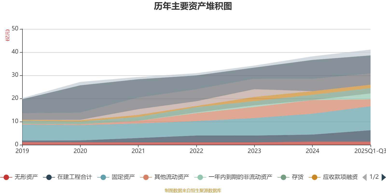 资产重大变化方面,截至2025年三季度末,公司其他流动资产较上年末减少49.14%,占公司总资产比重下降8.15个百分点;一年内到期的非流动资产占公司总资产的6.23%,上年末为0;在建工程合计较上年末增加62.26%,占公司总资产比重上升4.03个百分点;货币资金较上年末减少4.61%,占公司总资产比重下降2.43个百分点。