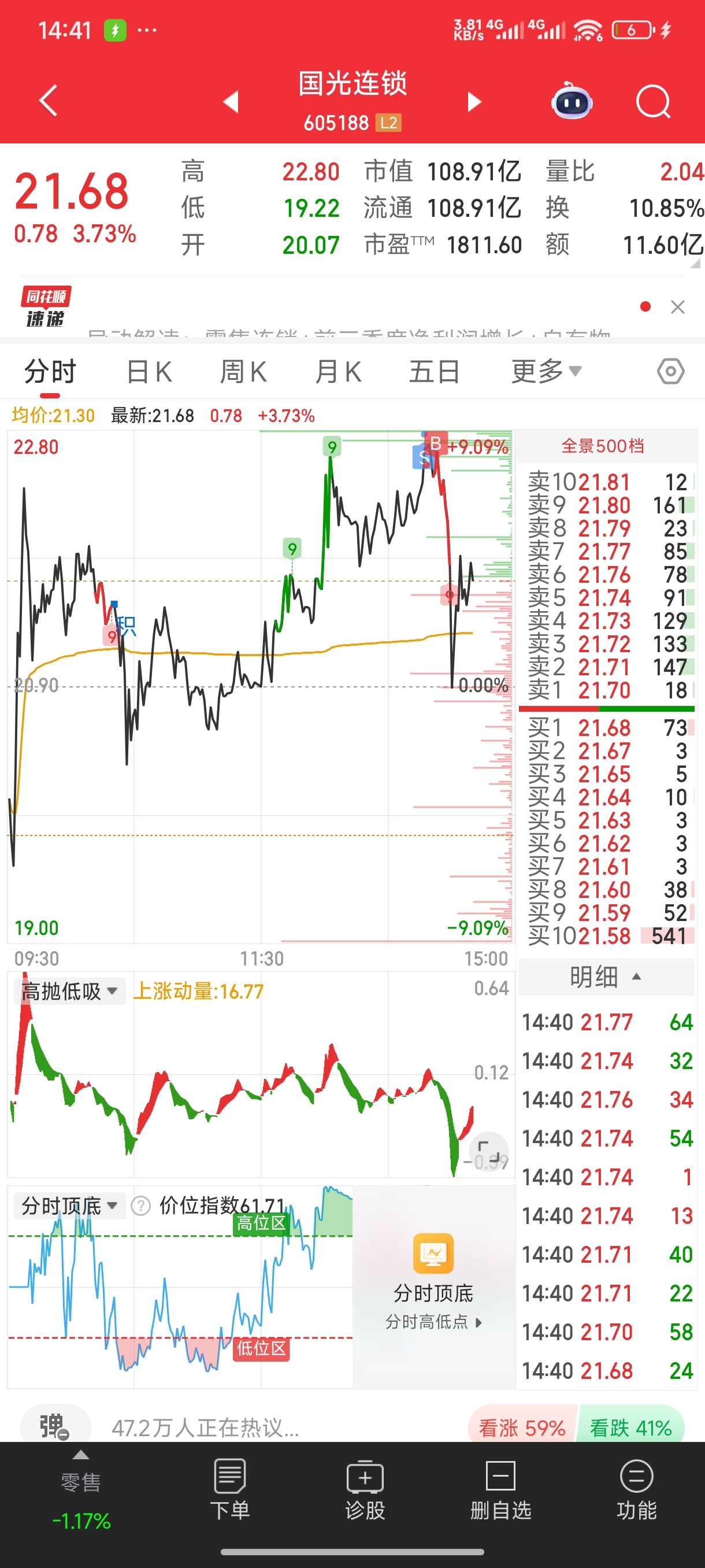 $国光连锁(SH605188)$ 我滴个乖乖,22.79卖了22.5接回去,几分钟给我搞这个事情来