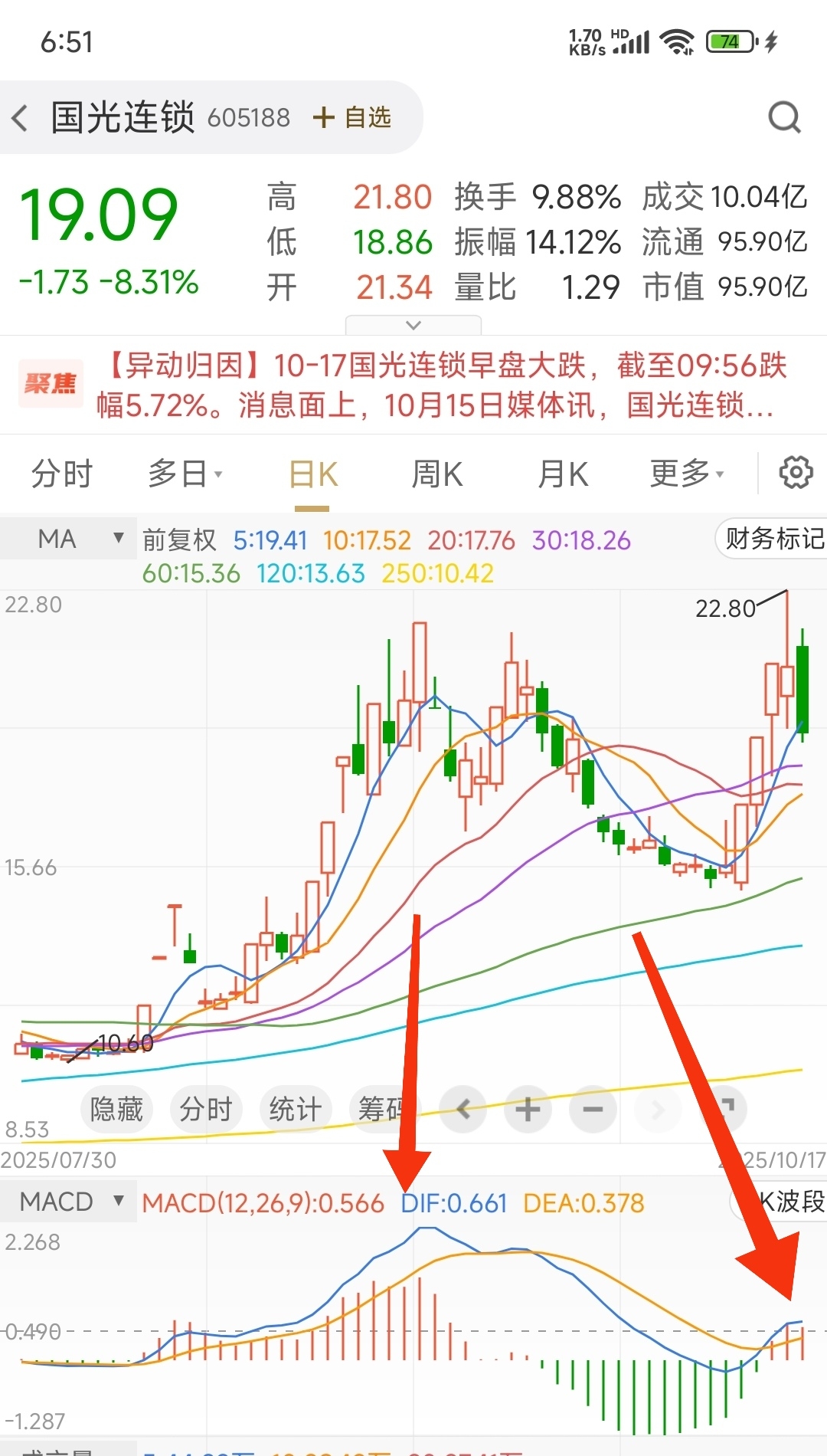 $国光连锁(SH605188)$ 非常明显的背离形态见顶信号,股价创了新高,但是macd指标并没有超过上一个高点,macd指标背离,股价已经见顶,昨天和今天里面的主力资金都在逃顶出货,留下散户们在山顶一览众山小。主力走了,周一就剩下散户踩踏了,个人看周一地板上开出,如果两连板跌停的天普没有资金去翘板走出小地天收大阳线的话,那国光就不会打开跌停板。