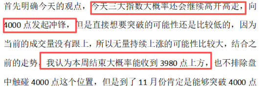 昨天的走势和我早盘的预期基本上一致,高开高走成功再次走强,并且还高于我的预期,上证指数最高点达到了3999.97,就差0.03点就突破4000点,昨天收盘后再次传来多项利好,看样子现在的态度很明确,就是想要将我们的股市给拉上去,所以4000点今天开盘可破,4000点顺利突破,记住这里不是结束,而只是行情的开始,记住今天,将开启A股牛市的新篇章!