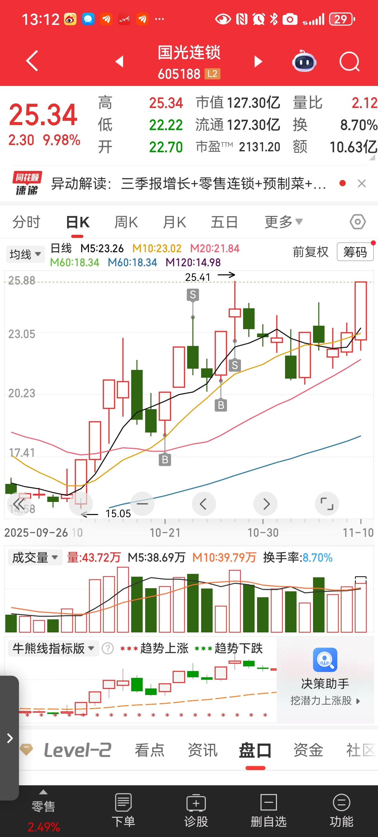 $国光连锁(SH605188)$ 国光连锁买卖了两次,盈利30多个点,今天真的是好买点,可惜仓位都在海马汽车和合富中国,顺钠股份,要不然今天进国光连锁了