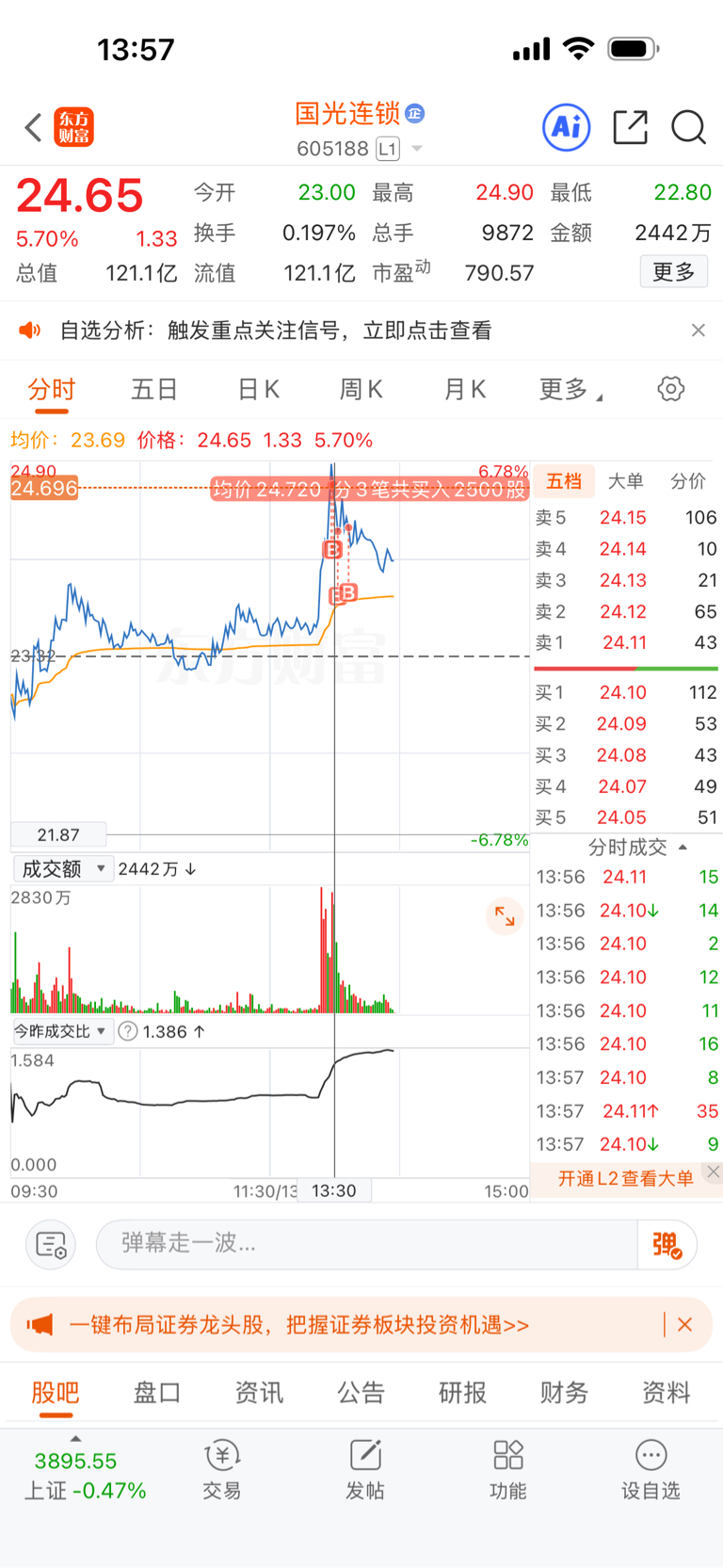 $国光连锁(SH605188)$ 高位进去求主力拉个涨停让我红一点