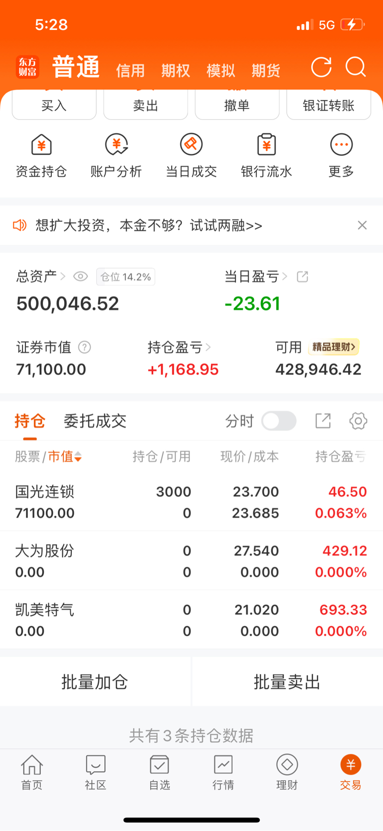 今天午盘介入国光连锁,早盘卖出凯美特气(虽然赚钱但是卖飞了)、卖出大为股份(逃顶成功)