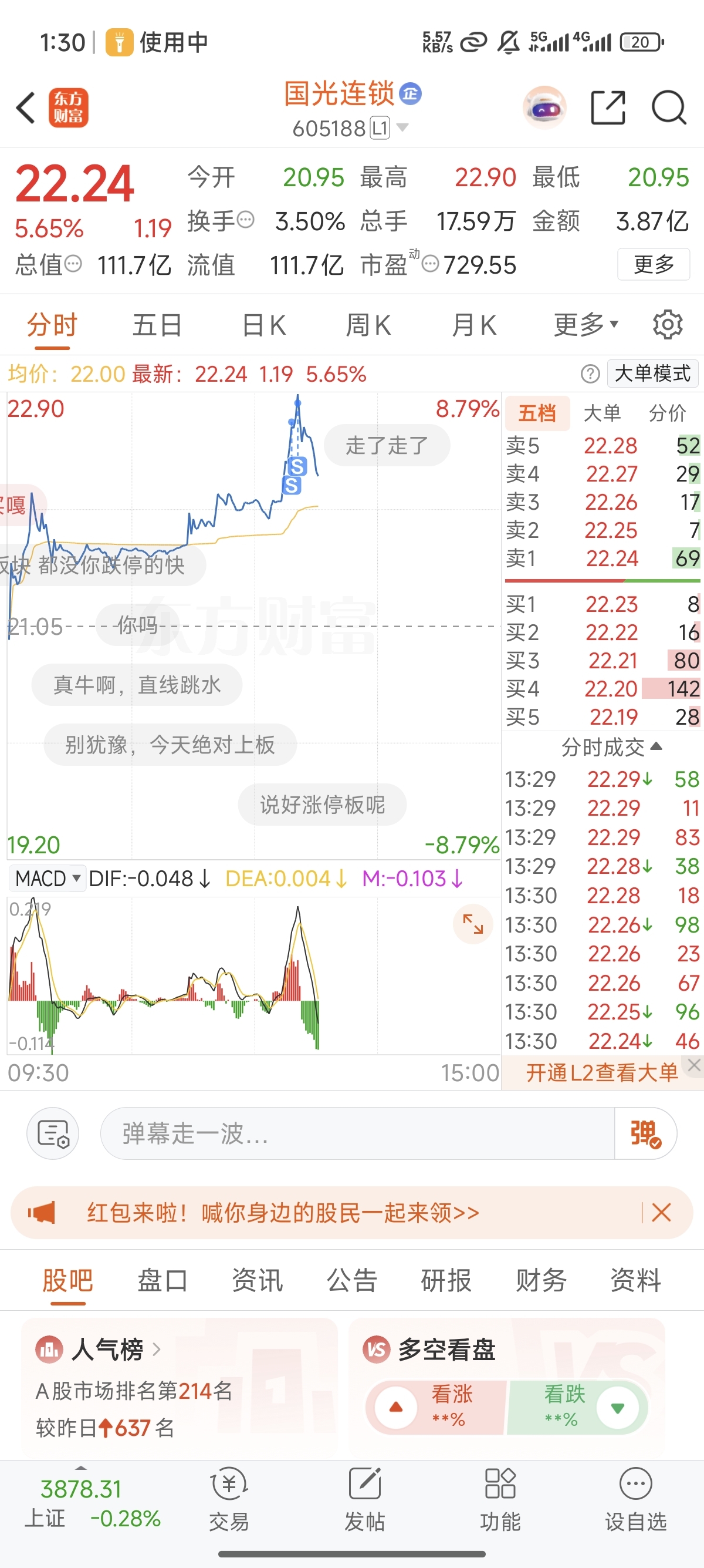 $国光连锁(SH605188)$ ggls依旧没有封板,跟上次一样,摸到九个点就回落,次日冲高五个点开始横盘,下跌。