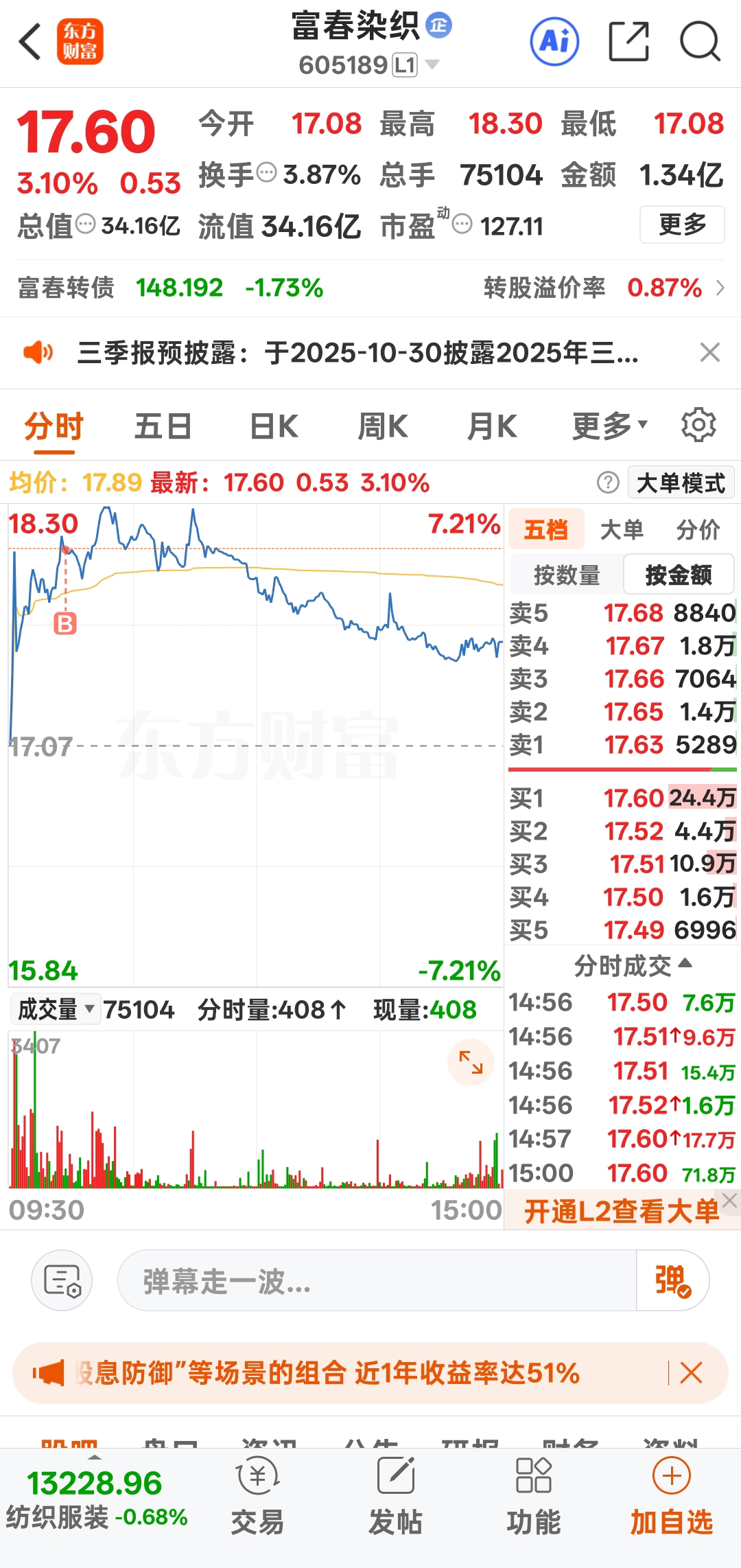 $富春染织(SH605189)$ 两天的亏损快打没啦这月的收益……,回撤控制的有点差,