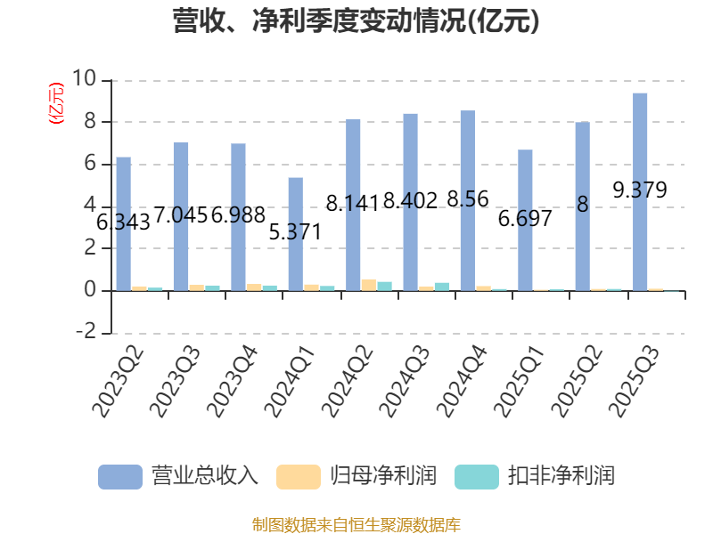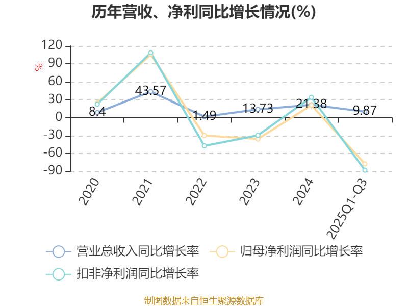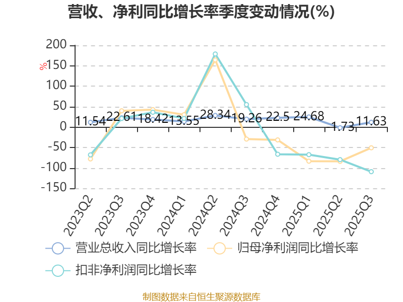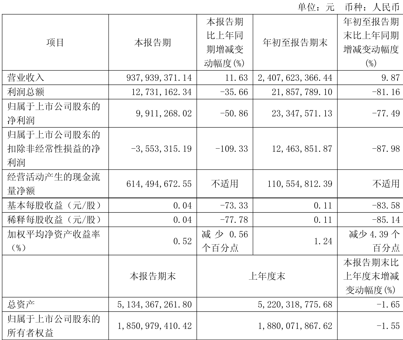 2025年前三季度,公司经营活动现金流净额为1.11亿元,同比增加6.54亿元;筹资活动现金流净额7851.05万元,同比减少8.02亿元;投资活动现金流净额-8766.75万元,上年同期为-3.8亿元。