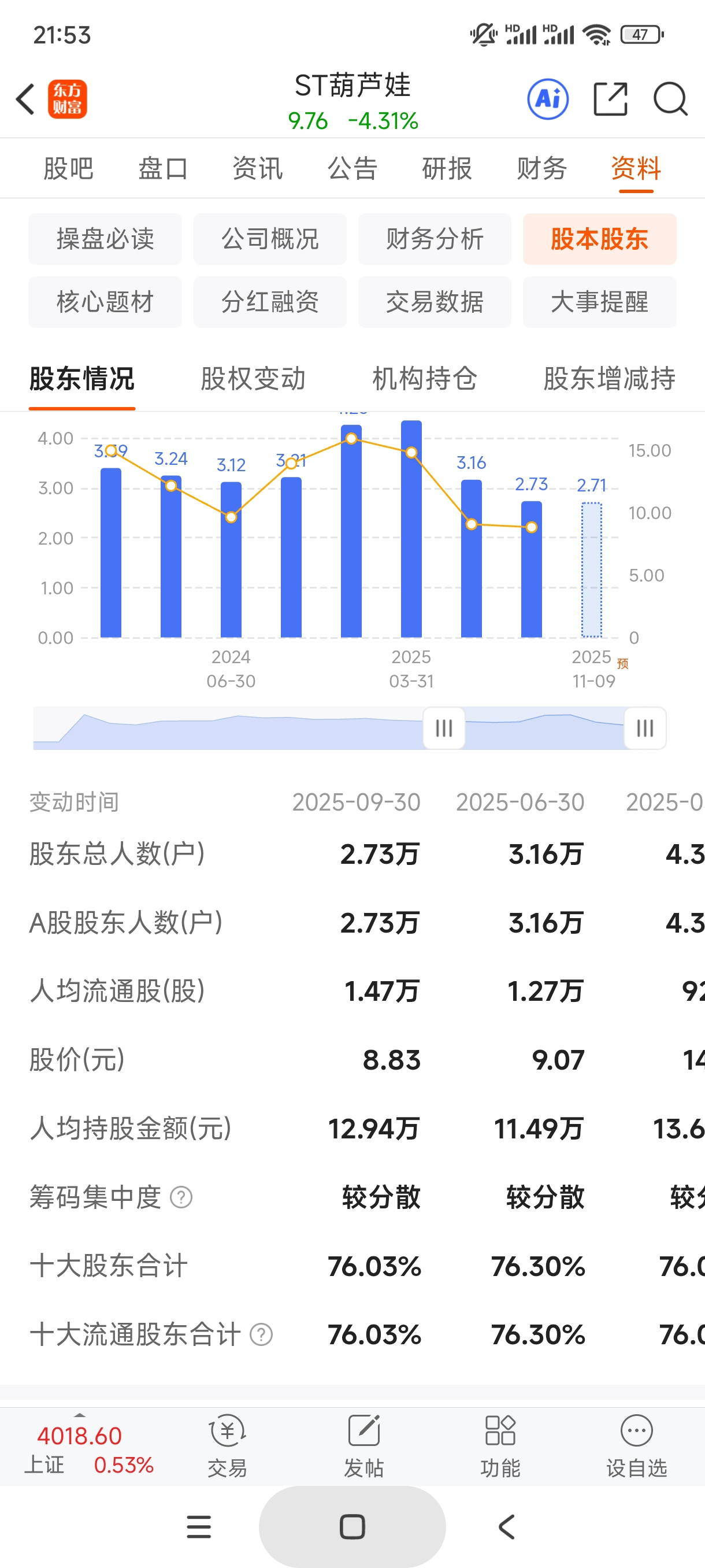 $ST葫芦娃(SH605199)$ 持股人数越来越少,好事