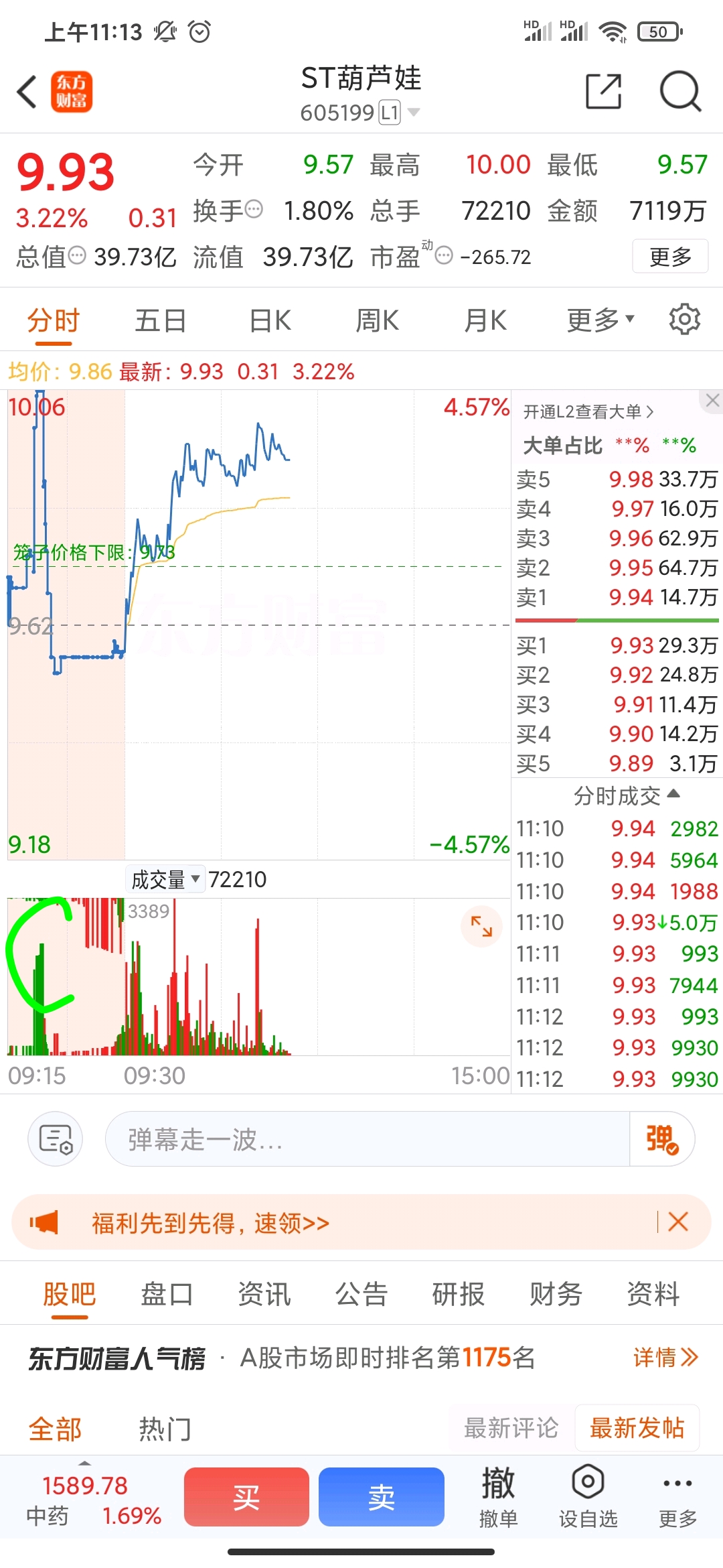 $ST葫芦娃(SH605199)$ 为什么不涨呢,这两天试盘都有大量人要卖,有人卖主力就不会高位去接你的货