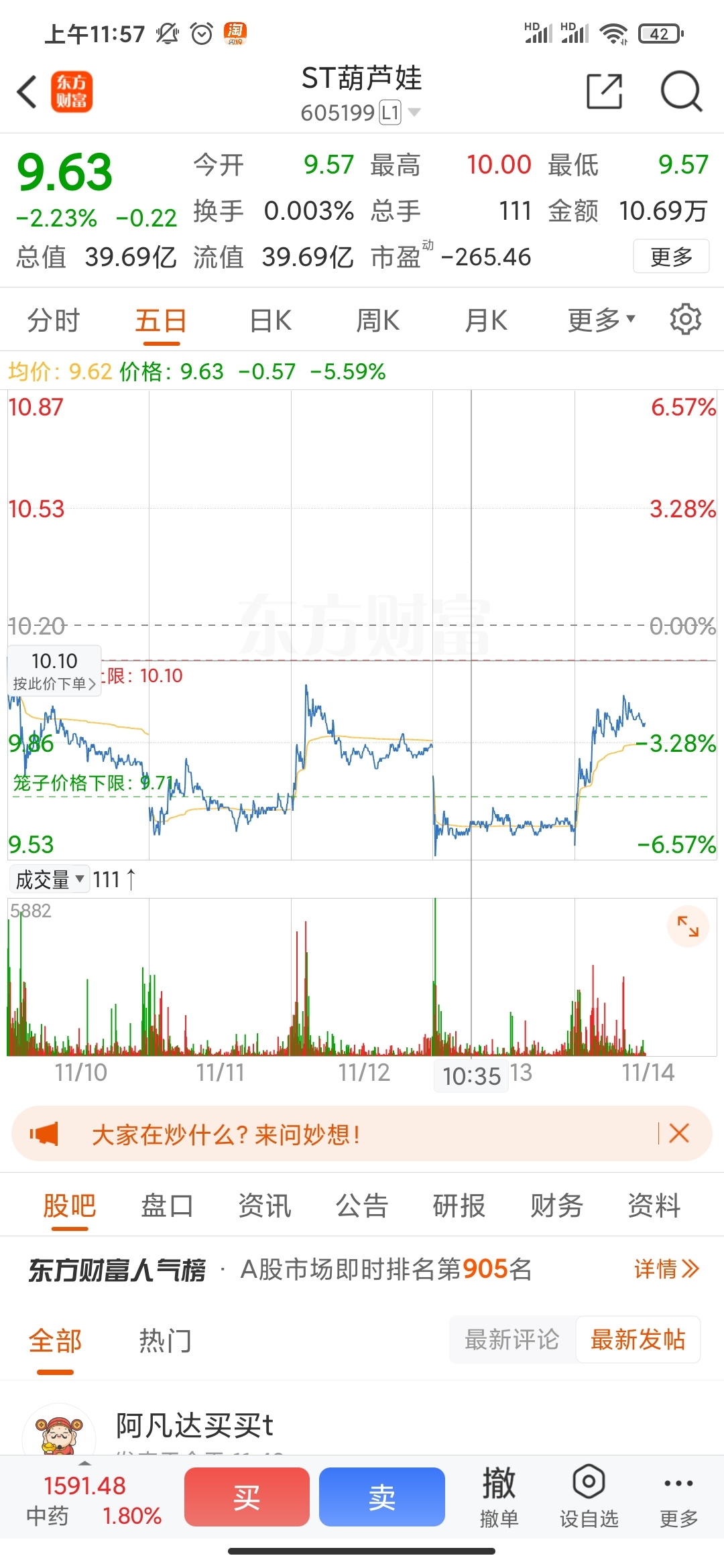 $ST葫芦娃(SH605199)$ 今天若能封板刚到跳水沿但仍差一分钱,考虑到二四跳水不指望你过两关先收复四下周一回调下周二再进攻就可以攻下城门了