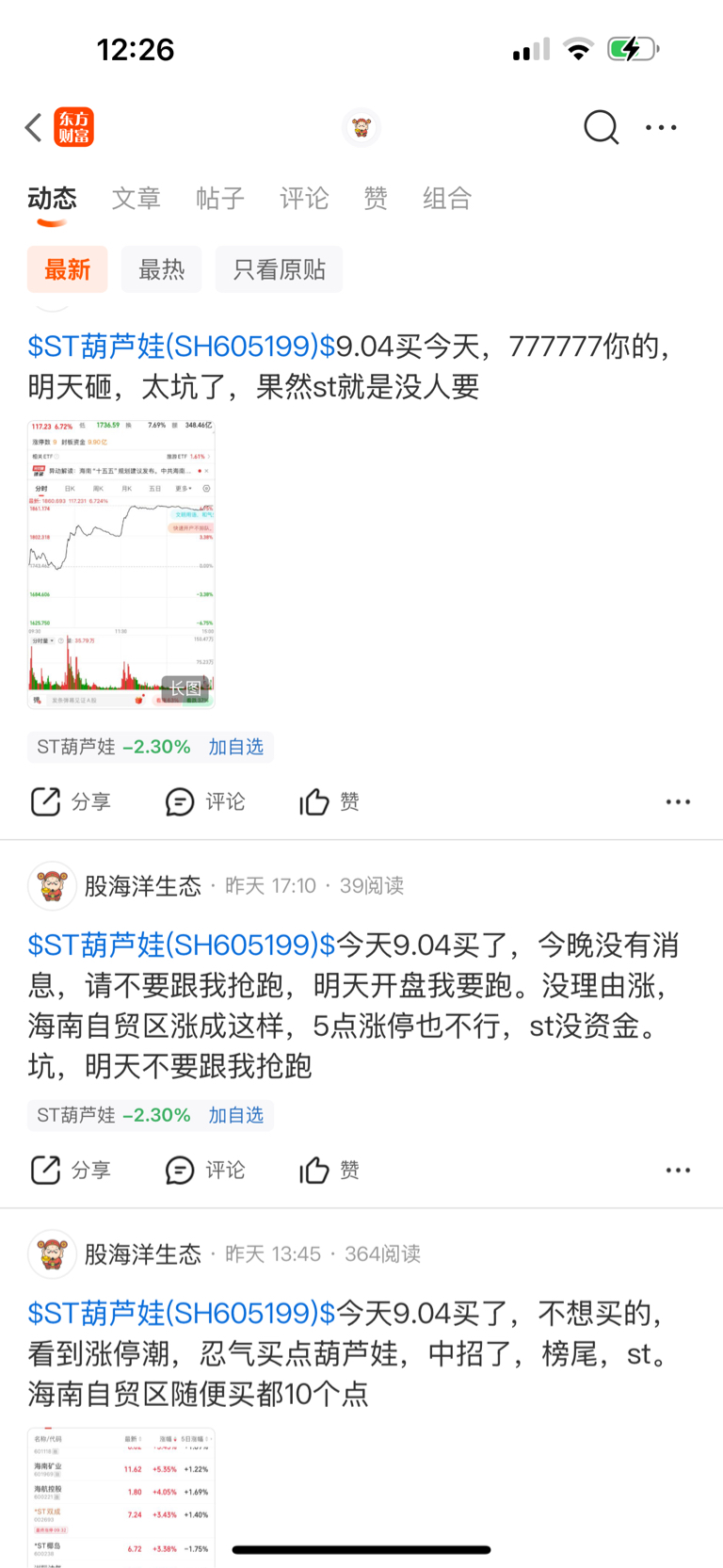 $ST葫芦娃(SH605199)$ 昨天9.04买,今天9.08砸了,恐惧葫芦娃。没人要,st,中期没有涨的理由。