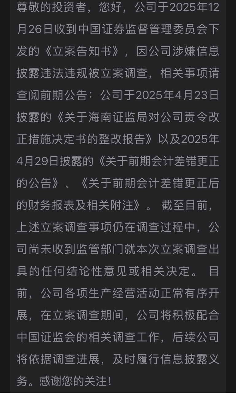 如果没有新的问题,这些事情是不会退市的,这次立案相当于例行公事。
