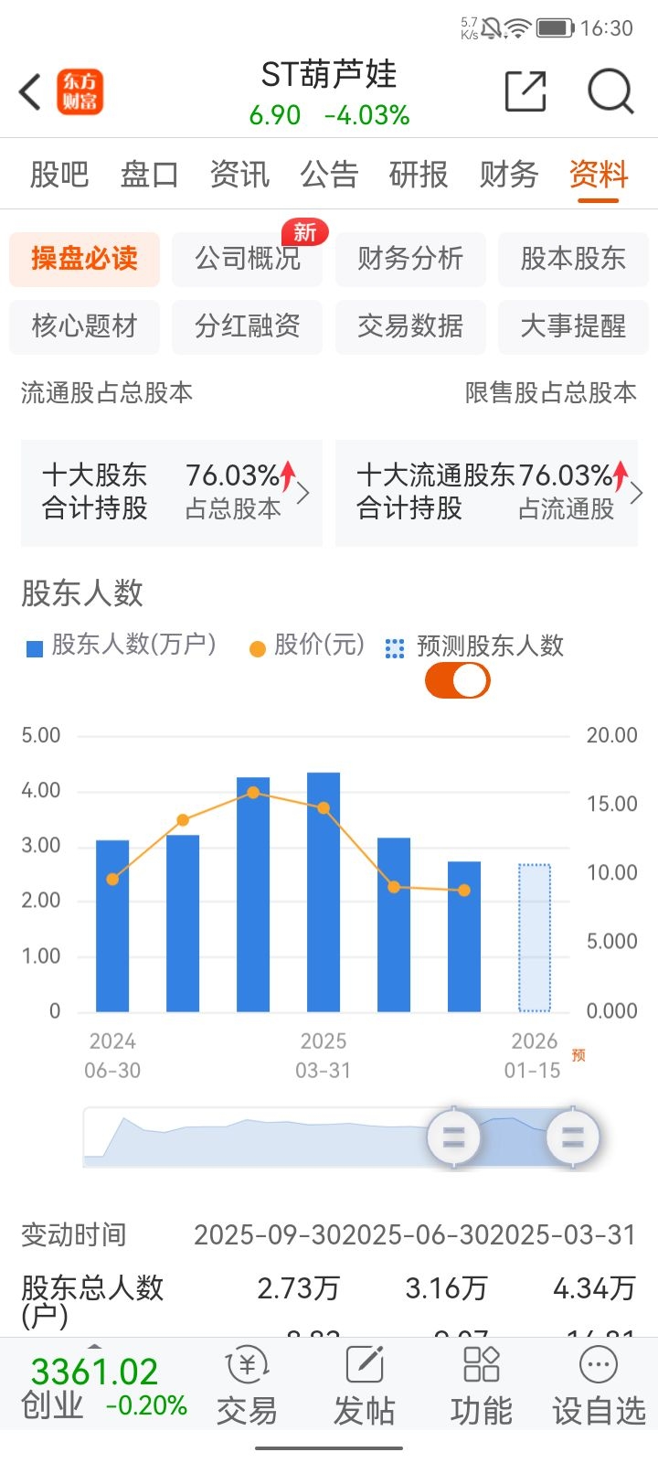 $ST葫芦娃(SH605199)$ 股东人数创三年新低:说明机构席位增加,散户席位减少!