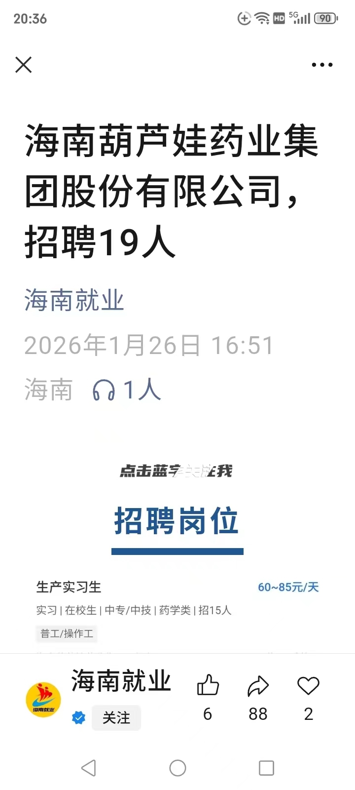 《海南葫芦娃药业集团股份有限公司,招聘19人》海南就业2026年1月26日16: