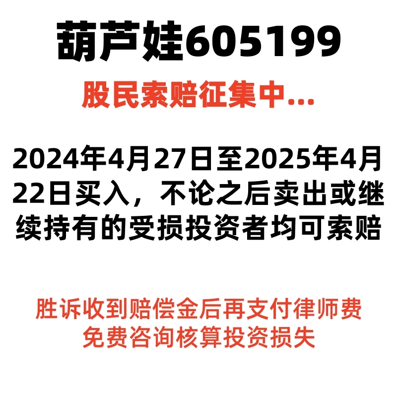 $ST葫芦娃(SH605199)$ 暂定2024年4月27日至2025年4月23日(含)期间有买入且在2025年4月23日后卖出或继续持有的受损投资者@索赔倒计时