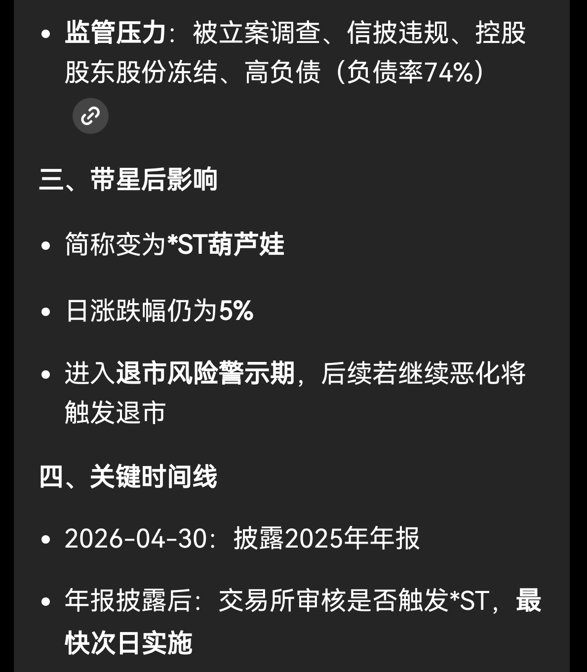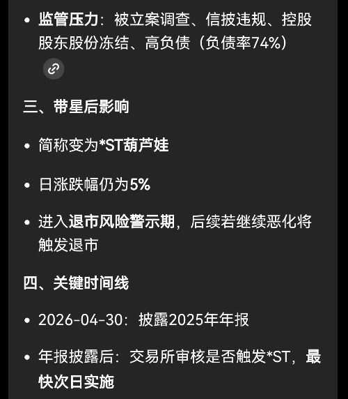 ST葫芦娃 4月30号 公布年报严重亏损,肯定带星变成*ST,必会退市大跌!